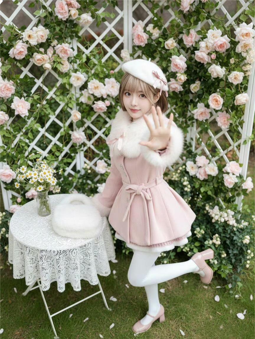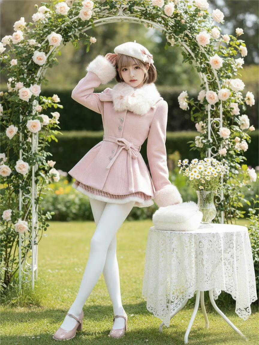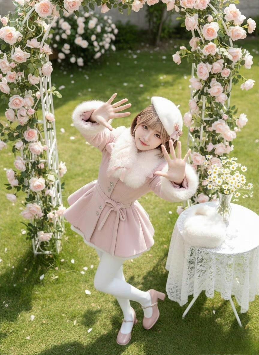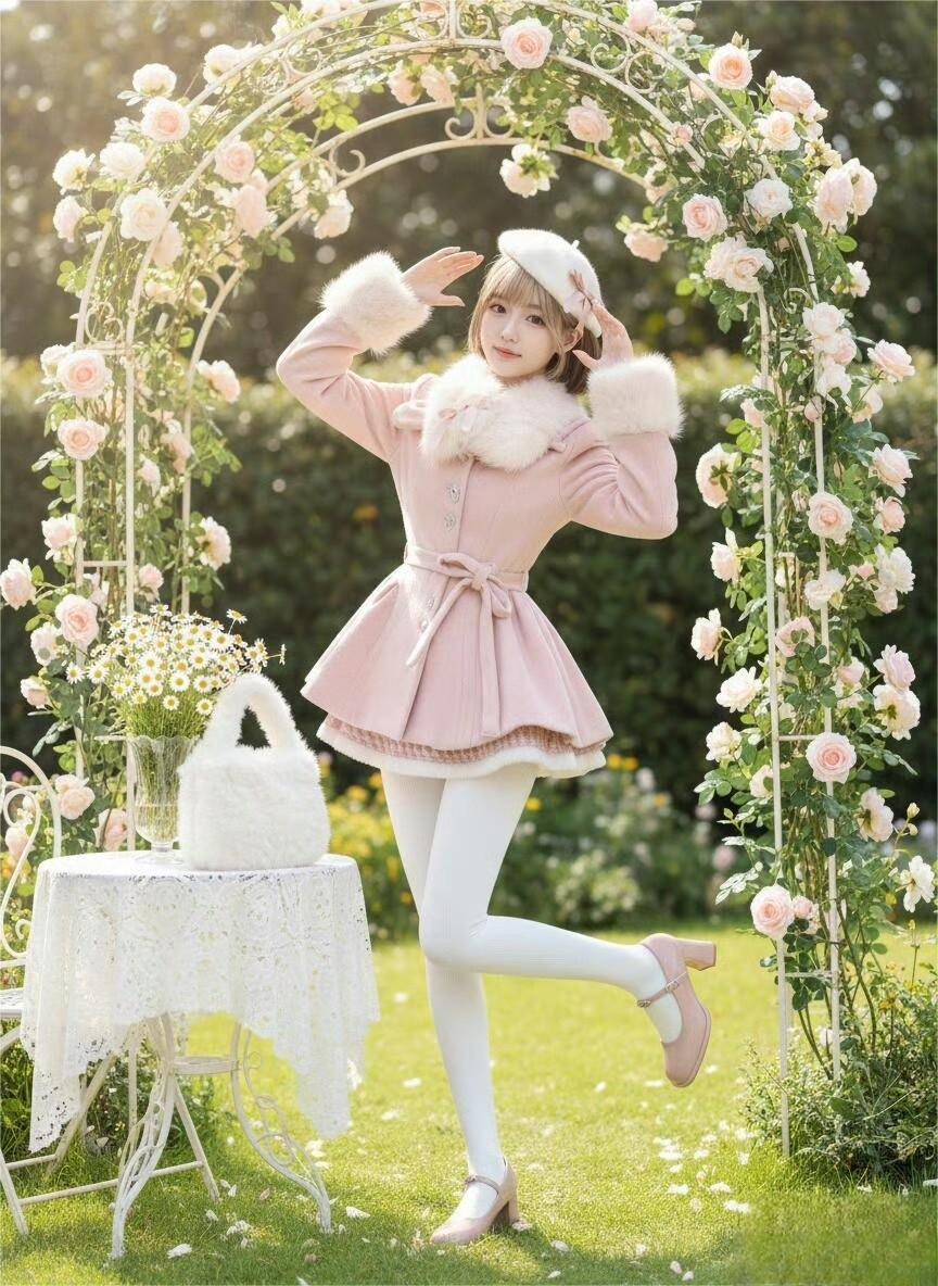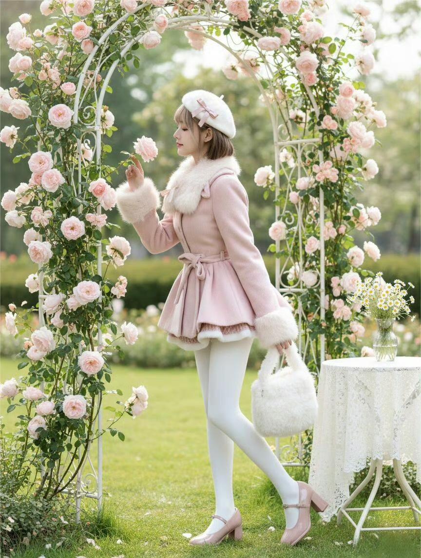 这套穿搭是典型的洛丽塔(Lolita)甜美优雅风,充满了复古少女的浪漫气息。粉色收腰外套自带蓬松裙摆,搭配毛绒领与袖口,甜美元素拉满;收腰系带设计凸显腰线,复古的纽扣与裙摆层次感,完美契合洛丽塔风格的精致感。 白色贝雷帽强化了清新少女感;粉色玛丽珍鞋与外套色调呼应,温柔又复古;背景的花艺装饰更衬出整体造型的“花园公主”氛围。能充分展现穿着者甜美优雅的复古少女魅力。洛丽塔风穿搭 洛丽塔穿搭 我的宝藏兴趣