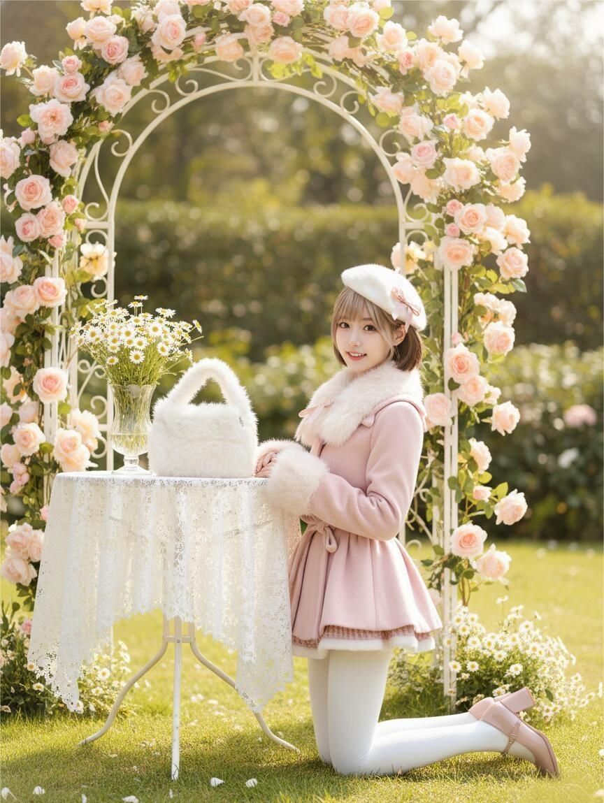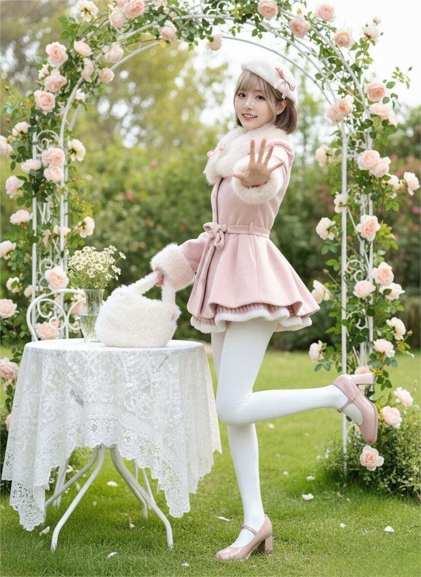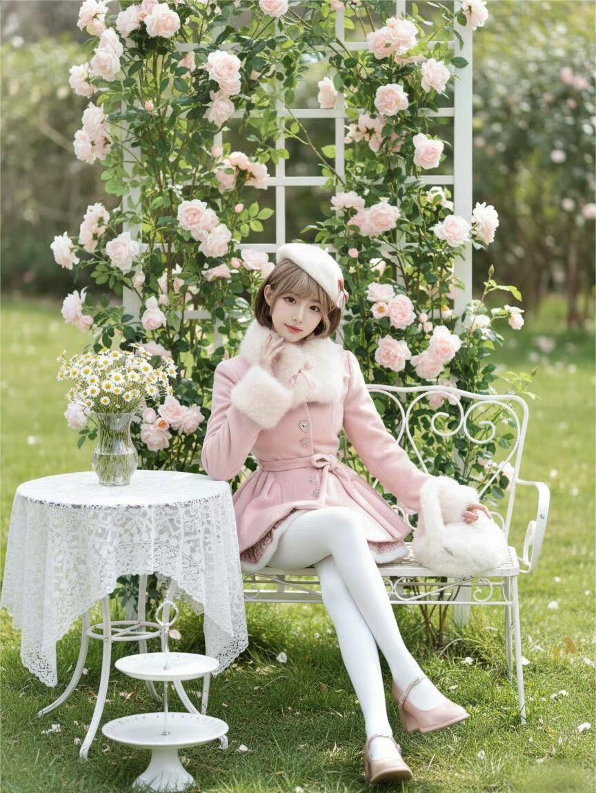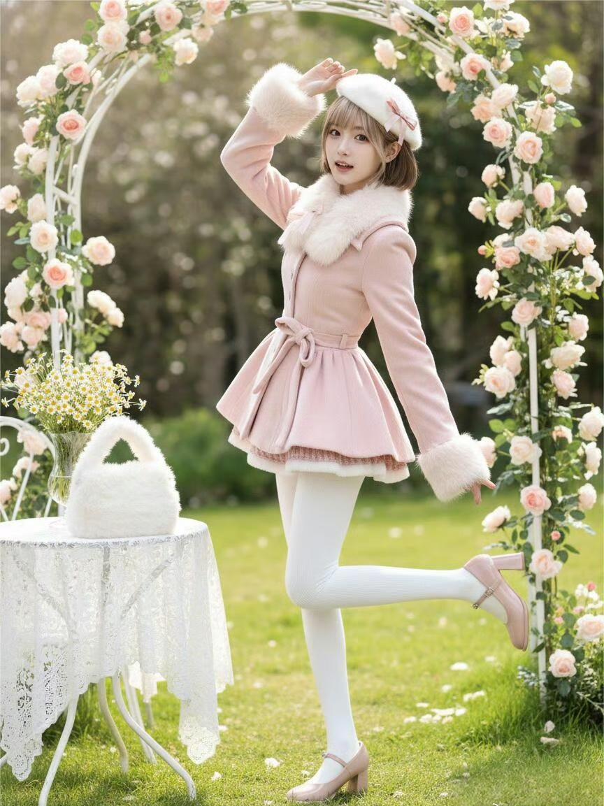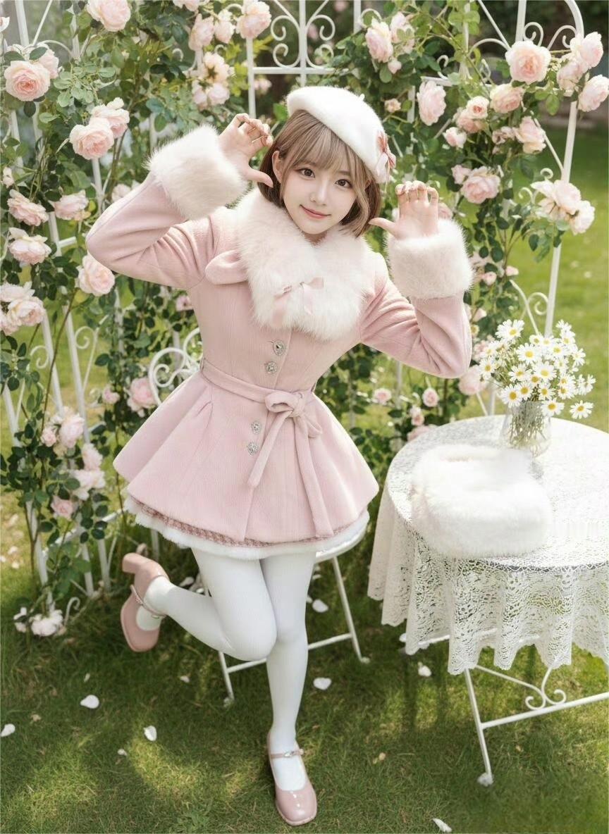 这套穿搭是典型的洛丽塔(Lolita)甜美优雅风,充满了复古少女的浪漫气息。粉色收腰外套自带蓬松裙摆,搭配毛绒领与袖口,甜美元素拉满;收腰系带设计凸显腰线,复古的纽扣与裙摆层次感,完美契合洛丽塔风格的精致感。 白色贝雷帽强化了清新少女感;粉色玛丽珍鞋与外套色调呼应,温柔又复古;背景的花艺装饰更衬出整体造型的“花园公主”氛围。能充分展现穿着者甜美优雅的复古少女魅力。洛丽塔风穿搭 洛丽塔穿搭 我的宝藏兴趣