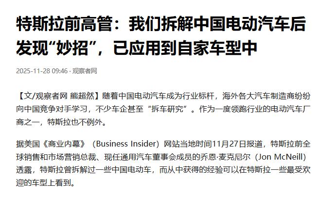 美国这就开始偷中国技术了,特斯拉前高管:我们拆解中国电动汽车后发现“妙招”,已应用到自家车型中。 美国曾经引以为傲的汽车工业,现在正忙着把中国生产的电动车拆成一地零件。这并非坊间传闻,而是出自通用汽车现任董事、前特斯拉全球销售总裁乔恩·麦克尼尔之口。 这位见证过汽车行业风云变幻的高管直言不讳地承认,特斯拉曾通过拆解中国车汲取了关键经验,而通用的团队近期也在做同样的事情。 过去,美国舆论场总喜欢给中国制造贴上“只会模仿”的标签,但现实正在上演一出极具讽刺意味的反转剧:曾经的“导师”拿起了螺丝刀,对着昔日“学生”的作业抄得不亦乐乎。麦克尼尔把这种学习心态形容为“像海绵一样”,吸纳着大洋彼岸的工业智慧。 让美国汽车工程师们感到震惊的,并非什么花哨的概念,而是藏在车身蒙皮之下那些枯燥却致命的细节。 当麦克尼尔和通用的工程师们拆开一辆比亚迪时,他们发现了一种被运用到极致的“乐高式”智慧。通常,传统车企即便在同一个品牌下,不同车型也往往各行其是。 麦克尼尔举了一个生动的例子:在丰田的体系里,卡罗拉和凯美瑞虽然都是轿车,但它们的热泵、座椅驱动器甚至内部结构都是截然不同的。这意味着每一款新车都需要单独设计一套系统,成本自然居高不下。 但在中国车的引擎盖下,美国人看到了另一番景象。无论是雨刮器电机、热泵系统,还是深埋在座椅内部那些根本看不见的微型电机,中国工程师都极度严谨地实现了跨车型的统一规格。 哪怕你把比亚迪不同系列的车型全部拆散,会发现这些基础“器官”竟然是通用的。这种做法极其聪明,毕竟没有哪个司机会因为雨刮器电机的型号不同而感觉到驾驶体验的差异,但对于车企来说,这背后是巨大的成本优势和量产效率。 这种发现其实早就体现在了特斯拉最畅销的产品上。麦克尼尔回忆起他在职的2015年到2018年期间,那正是特斯拉Model3深陷“产能地狱”的至暗时刻。 正是借鉴了中国电动车这种零部件复用的思路,特斯拉才得以爬出泥潭。就连马斯克后来在财报会上也曾证实,ModelY竟然与Model3共享了约75%的零部件。这种策略让新车型的推出变得像搭积木一样迅速,而不再是每一次都要重新发明轮子。 但这套看似简单的“抄作业”逻辑,对美国传统车企来说却并不好学。这种深度的零部件复用,不仅仅是设计理念的差异,更是供应链模式的降维打击。 现在的美国车企,包括像福特这样的老牌巨头,正面临一个结构性的短板:由于长期依赖外部供应商,各大车型项目组往往各自为营,导致根本无法统一部件规格。 反观中国的比亚迪、特斯拉以及Rivian这样的新兴势力,他们是高度垂直整合的公司。这意味着从电子架构到硬件生产,话语权掌握在自己手里,想怎么标准化就怎么标准化,这种系统化的优势让习惯了“组装厂”模式的传统巨头难以望其项背。 危机感已经让底特律的大佬们坐立难安。就连刚刚入局不久的小米SU7,也没能逃过被拆解研究的命运,这说明美国业界已经形成了一种共识:想活下去,就必须看看中国同行是怎么做的。 福特的一把手吉姆·法利此前的表态甚至带着一丝悲壮,他直言在拆解了特斯拉和中国电动车后,自己感到了“惭愧”。 那是真正的“觉醒时刻”,那种技术和成本控制上的差距,让他不得不承认,对手的产品处于领先地位,并因此痛下决心将福特的电动车业务拆分重组。 从被污蔑“只会抄袭”,到如今被对手摆在实验室里逐个零件地“逆向工程”,中国电动车凭借的不是谁的恩赐或补贴,正如拆解结果所展示的那样,是这些看不见的硬核细节构建起了真正的壁垒。 时代确实变了,当原本的领跑者开始气喘吁吁地研究追赶者的跑鞋设计时,实力的天平早就已经倾斜了。