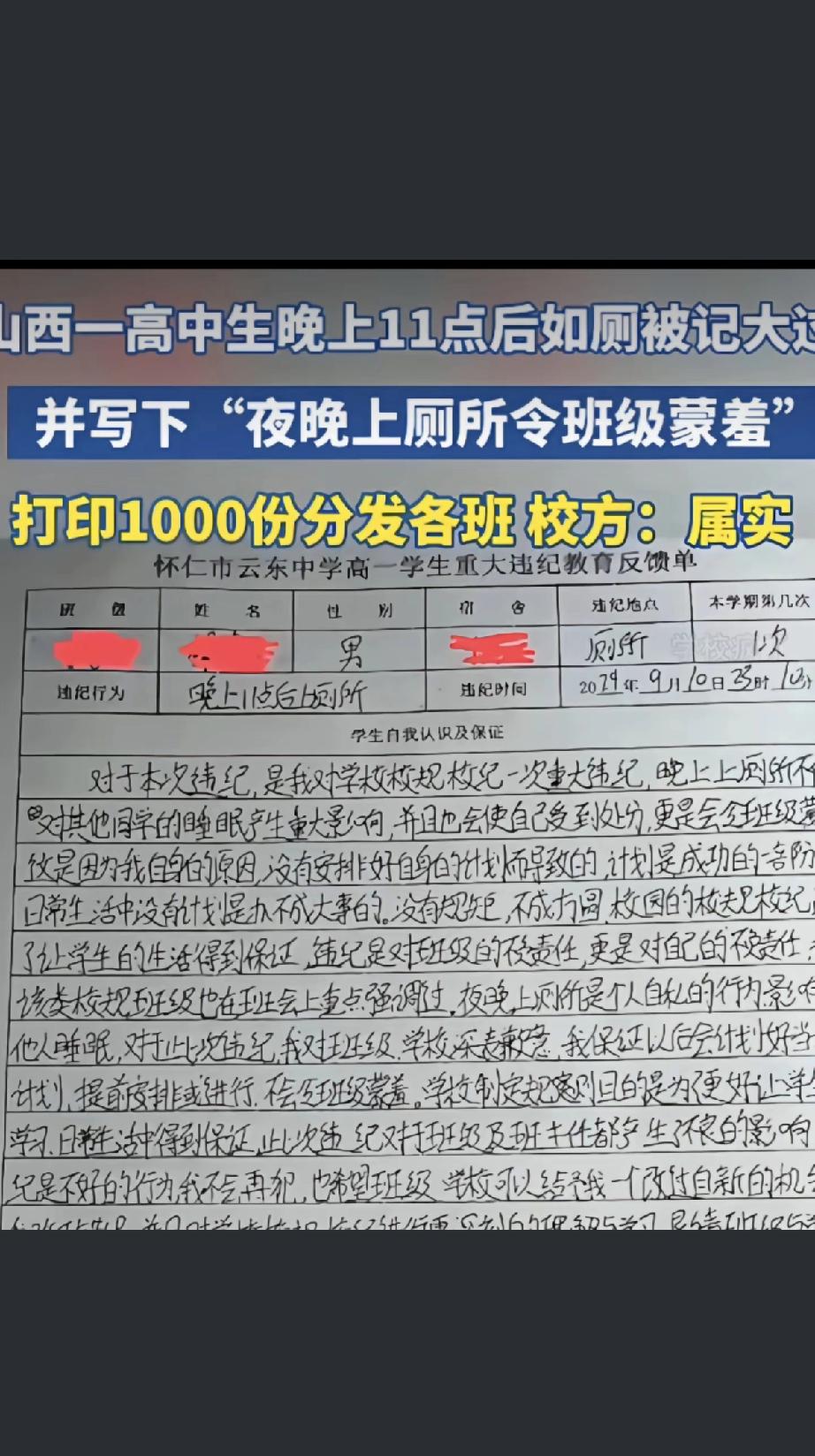 看到这个视频,虽然是以前的,简直让人不敢相信。 高中生晚上11点后上厕所,竟然被记大过,还被要求写下“夜晚上厕所令班级蒙羞”的检讨,甚至要打印1000份分发各班。这哪是管理,简直是荒唐! 人有三急,这是最基本的生理需求。把正常生理现象当成违纪来处罚,不仅不近人情,更违背了教育的初衷。学校是教书育人的地方,不该变成压抑人性的牢笼。