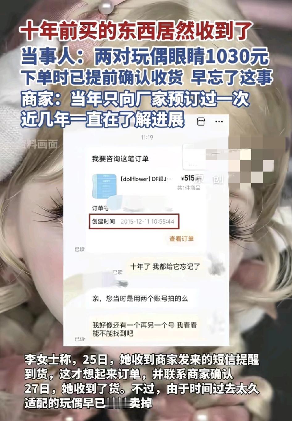 上海有网友称收到了10年前购买的订单。当时花了1030元购买的玩偶眼镜,由于工艺复杂,有部分原材料还断货,所以当时约定的时间是两年,但是由于女子同意了提前确认收货,早就把这件事忘记了,最近才收到商家发过来的短信,货已经发出去了,但是由于往后早期就卖掉了所以收到这副眼镜可能作用也不大了。难得的是商家守信用,10年过去了,没有倒闭,也会继续联系客户发货。