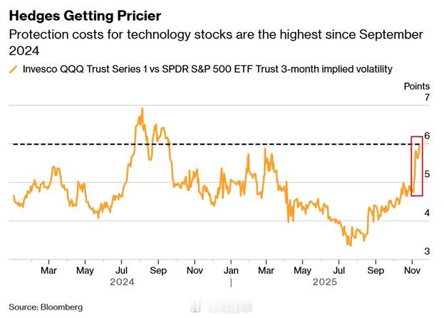 科技股的对冲成本正在飙升: 对冲纳斯达克 100 指数$QQQ相对于标准普 尔 500 指数$SPY下跌的成本达到约 6点,为 2024 年 9 月以来的最高水平。 自7月以来, 对冲的相对成本几乎翻了一番。 科技股的保护成本目前已接近 2024 年7月市 场回调期间的水平。 此前, 纳斯达克100指数在过去两周下跌了 4%。 与此同时, 看跌期权与看涨期权的比率跃升至 1.04,为 4 月以来的第二高水平。 恐慌情绪为交易者提供了机会。老常政经美股常涤非超话常涤非观点