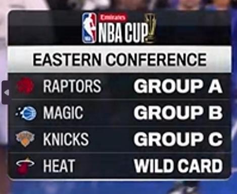 东部的1/4杯赛对阵已公布:魔术(B组第1,净胜分+64) vs 热火(东部外卡队,净胜分+49);猛龙(A组第1,净胜分+55)vs 尼克斯(C组第1,净胜分+35)2025NBA杯