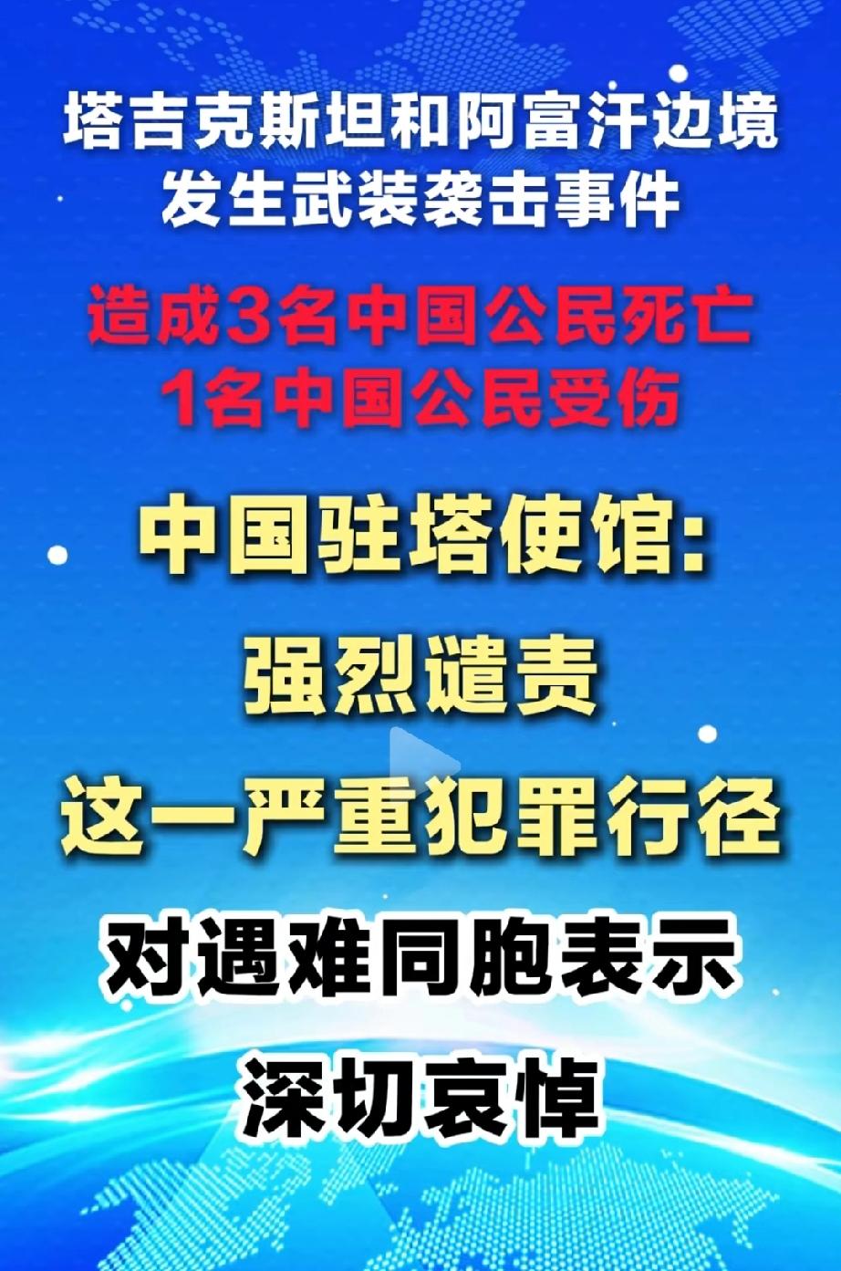 塔吉克斯坦和阿富汗边境,发生武装袭击事件,造成三名中国人死亡,一名中国人受伤。