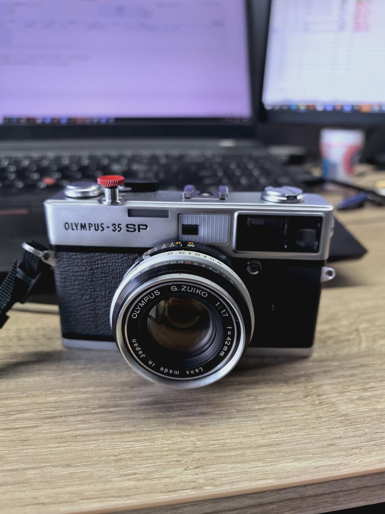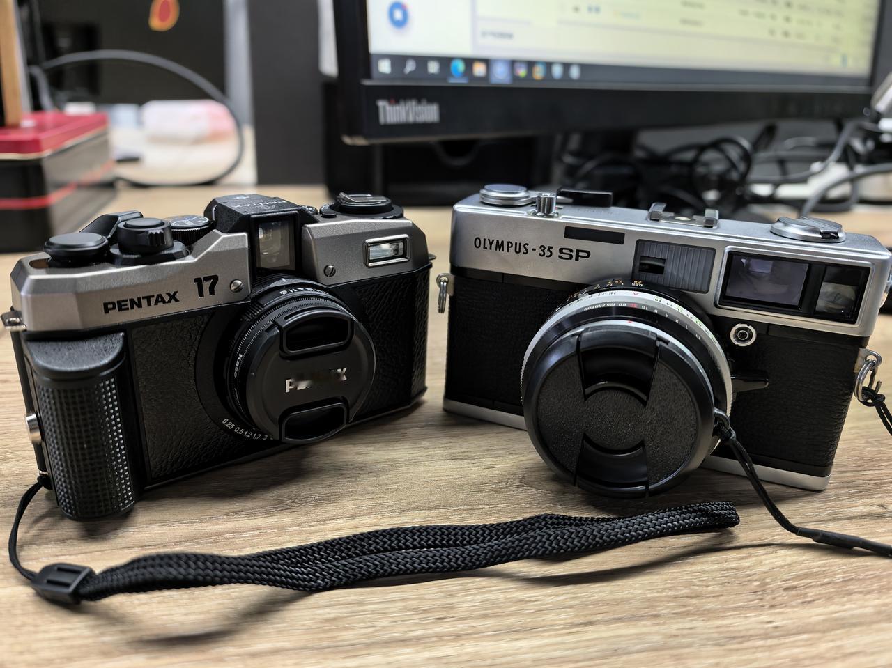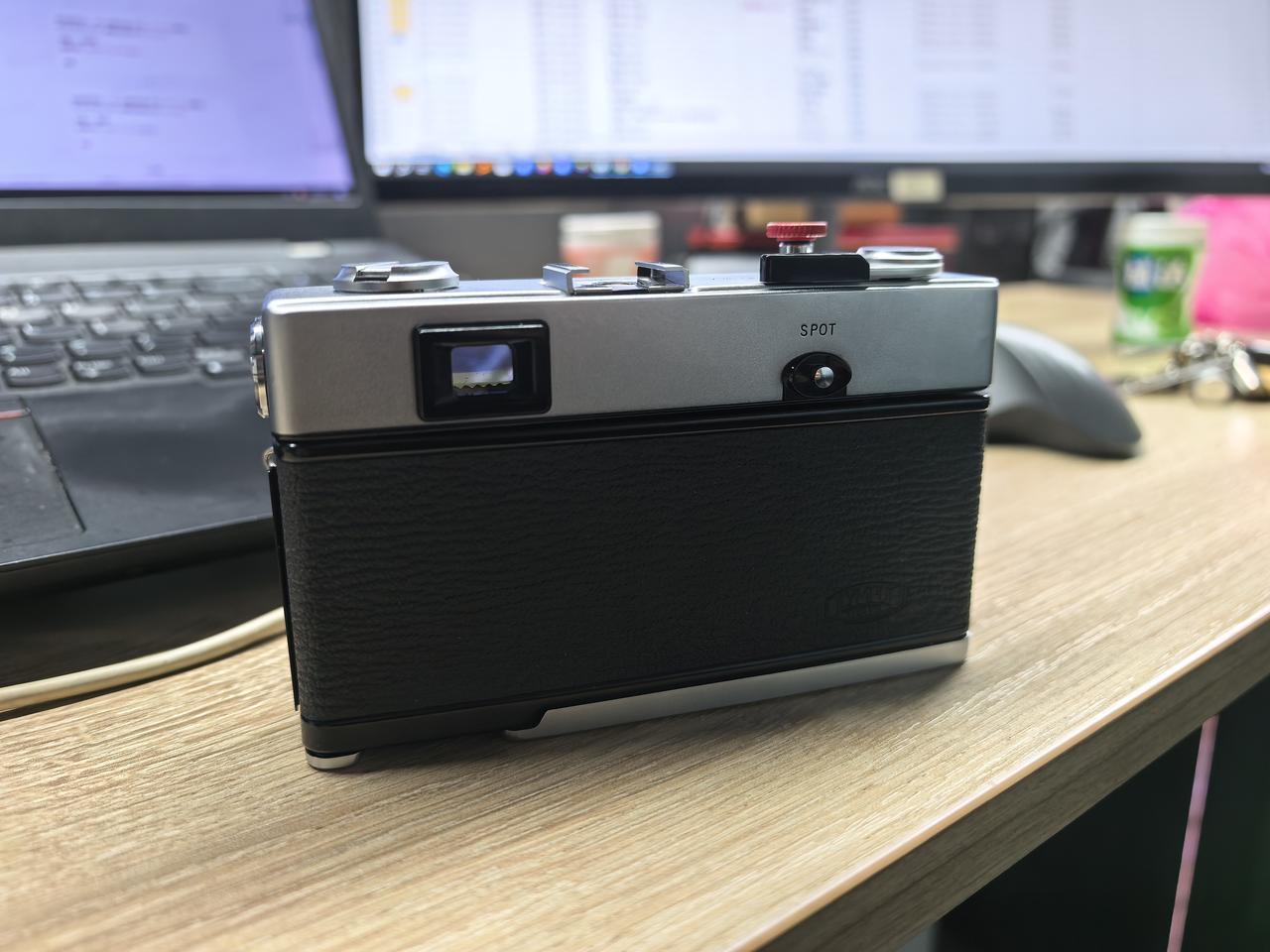 最近,没缘故的,突然想玩胶片了!单纯就是想尝试一番回归经典摄影的感觉,那种手动上卷、手动过片、手动测光、手动对焦的纯粹操控!底片冲洗之前的期待,还有冲印后开盲盒般的刺激,这些都是数码机器给不了的仪式感! 鉴于本人对于单反、无反系统比较熟悉了,想弥补一下对取景系统里另一重要分支旁轴系统的认知和操控缺失!(数码时代,除了天价的徕卡,已经没有真正的旁轴相机了,富士的X100系列属于类旁轴,因为它没有黄斑联动测距对焦) 果断入了这台成色还不错,产自1972年的奥林巴斯35SP固定镜头旁轴相机,这是一台纯机械中古相机,基本全金属的机身,十分厚重,做工可以说秒了当下许多塑料电子产品!除了测光需要用到电池(不用亦不影响),拍照(包括自拍)完全通过机械控制,镜头焦距42mm,7镜片双高斯结构(以锐不可当著称),最大光圈F1.7!据说它的画质不输同期徕卡(仅画质,不要期待它的做工、操控能和徕卡比),价格只有后者十分之一不到!无忌大佬把它奉为旁轴七剑之首,民间也广为流传着它是穷人的徕卡的说法!十分期待它的后续出片效果!让我们拭目以待吧。 最后一张左边是朋友买的去年上市的宾得17半格胶片机,右边是我这台年长52岁爷爷辈的35SP,大家觉得哪台更好看? 胶片摄影