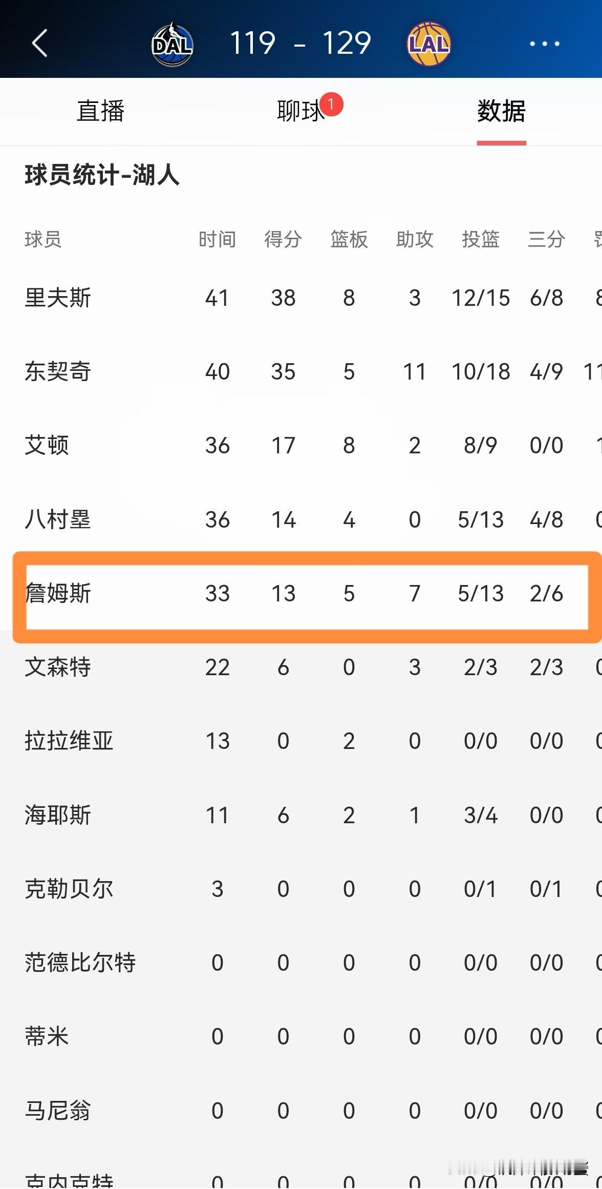 湖人老将詹姆斯真是出工不出力!在今天湖人主场以129:119力克独行侠的比赛中,詹姆斯完全是躺赢。 全场比赛下来,詹姆斯首发出战33分钟,投篮13中5,其中三分球6中2、罚球4中1仅仅得到13分,不过他的场上正负值为+13。 值得注意的是,本场比赛詹姆斯曾经不止一次的和因伤休战的欧文聊天,他的注意力并没有完全放在比赛中。