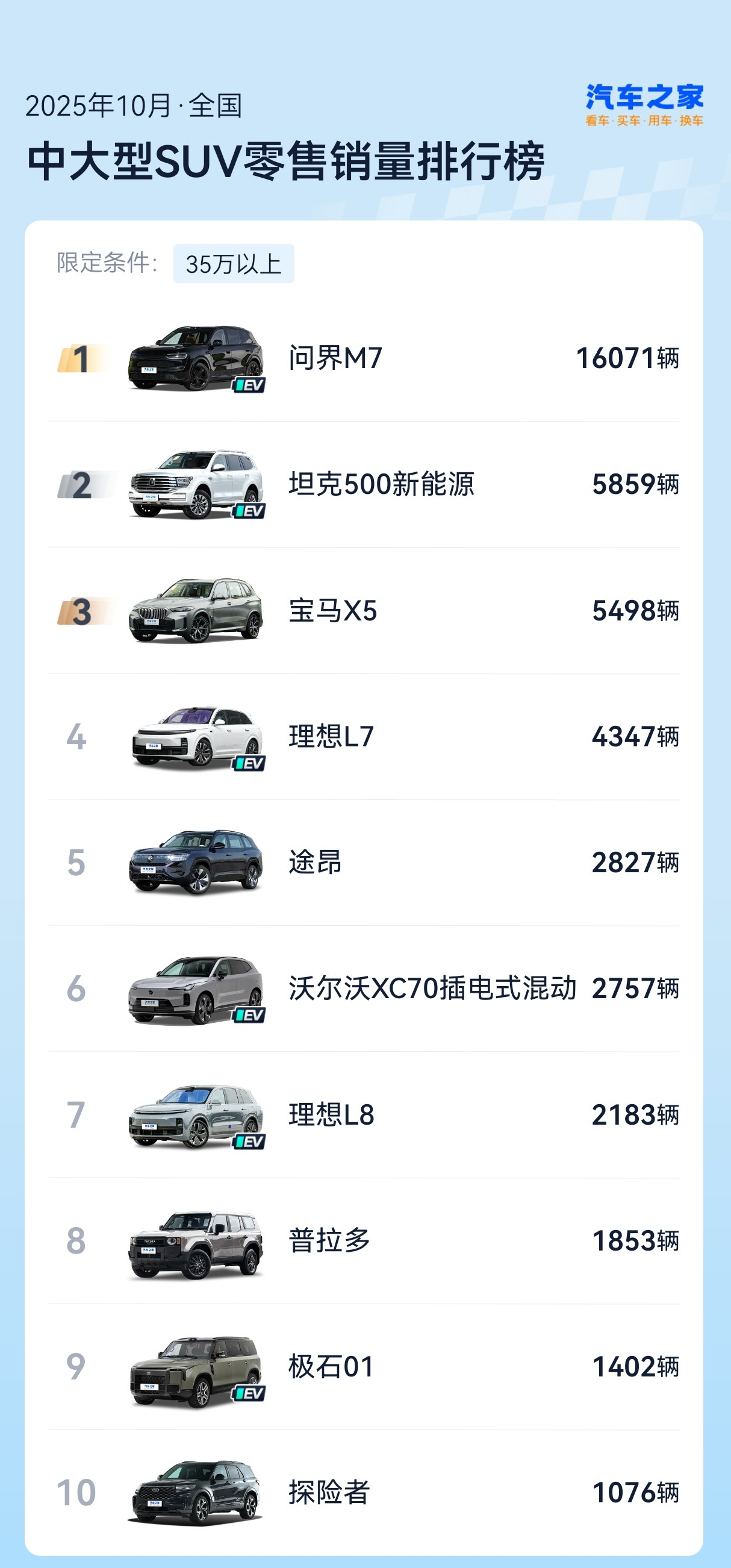 看了下 10 月销量,问界 M7 直接干到 16071 辆,说实话这成绩挺猛的,同级第二到第四名加起来都没它多。一方面是智驾、座舱这些体验确实挺顺手。另外现在全国都开始冷了,冬天开车最怕续航掉得离谱,而 M7 这块儿口碑还挺稳的。照这势头,后面冬季场景一起来,估计还能再涨一波问界M7成35万级中大型SUV销冠问界M7月销量超同级2至4名总和
