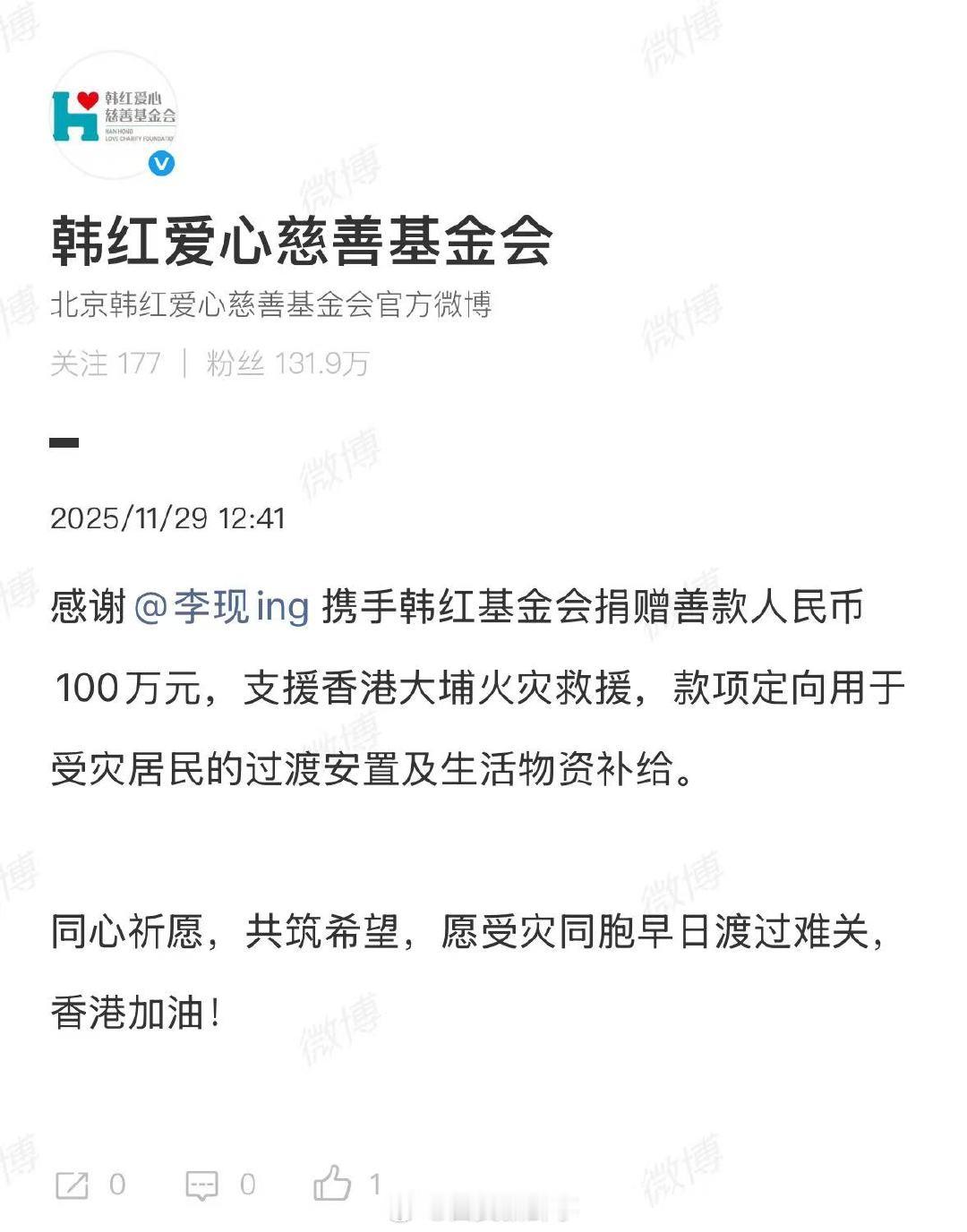 【李现为香港捐款100万】李现向香港捐款100万11月29日,发文:感谢 携手韩红基金会捐赠善款人民币100万元,支援香港大埔火灾救援,款项定向用于受灾居民的过渡安置及生活物资补给,同心祈愿,共筑希望,愿受灾同胞早日渡过难关香港加油!