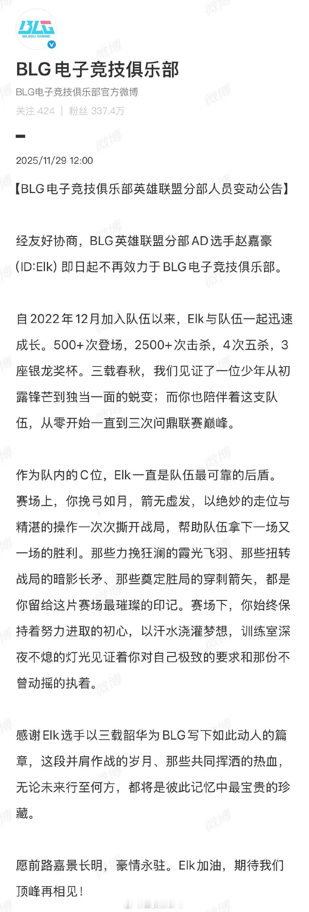 【BLG宣布Elk离队】BLG宣布Elk正式离队11月29日,发布人员变动公告:经友好协商,BLG英雄联盟分部AD选手赵嘉豪(ID:Elk)即日起不再效力于BLG电子竞技俱乐部。感谢Elk选手以三载韶华为BLG写下如此动人的篇章,这段并肩作战的岁月、那些共同挥洒的热血,无论未来行至何方,都将是彼此记忆中最宝贵的珍藏。愿前路嘉景长明,豪情永驻。Elk加油,期待我们顶峰再相见!