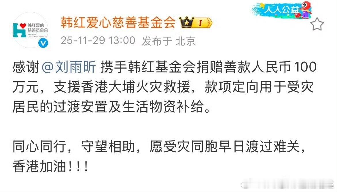 刘雨昕捐赠100万元刘雨昕向香港捐款100万元,款项定向用于受灾居民的过渡安置及