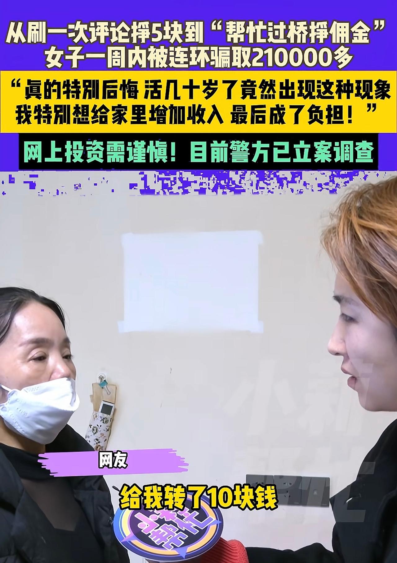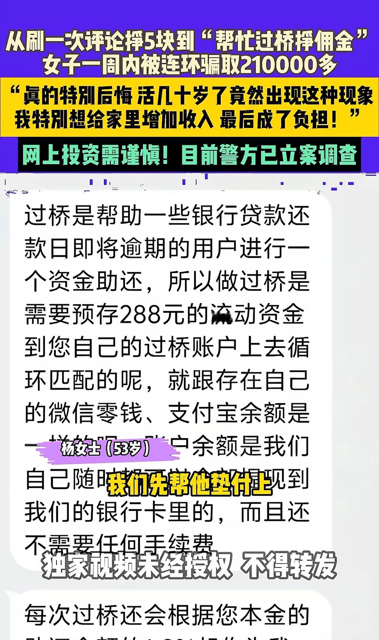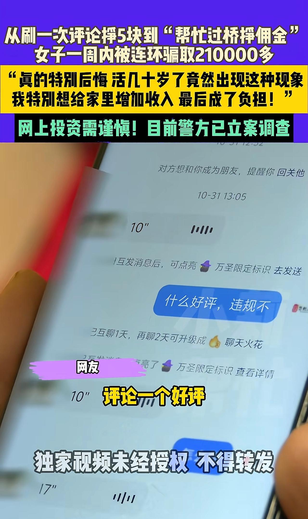 遭遇连环陷阱,最终被骗21万,千万别有贪心! 河南杨女士意外接到短信,一个好评返现5元,而没出意外好评后立即到账。紧接着变成了“助桥金”,也就是帮助垫还资金,同样按佣金返还,只是没想到第一单就要垫还3万元,佣金900元,钱也到了所谓自己的虚拟账户,紧接着来了个6.7万的单子,如果不做钱取不出来,就这样杨女士一单接着一单,没钱就告诉从贷款借钱,最终滚到21万才知道上当受骗。 本想挣钱帮助家庭,可却适得其反,所以一定不要侥幸,目前已经立案调查,希望尽快破案吧。高额骗局 全额退款骗局