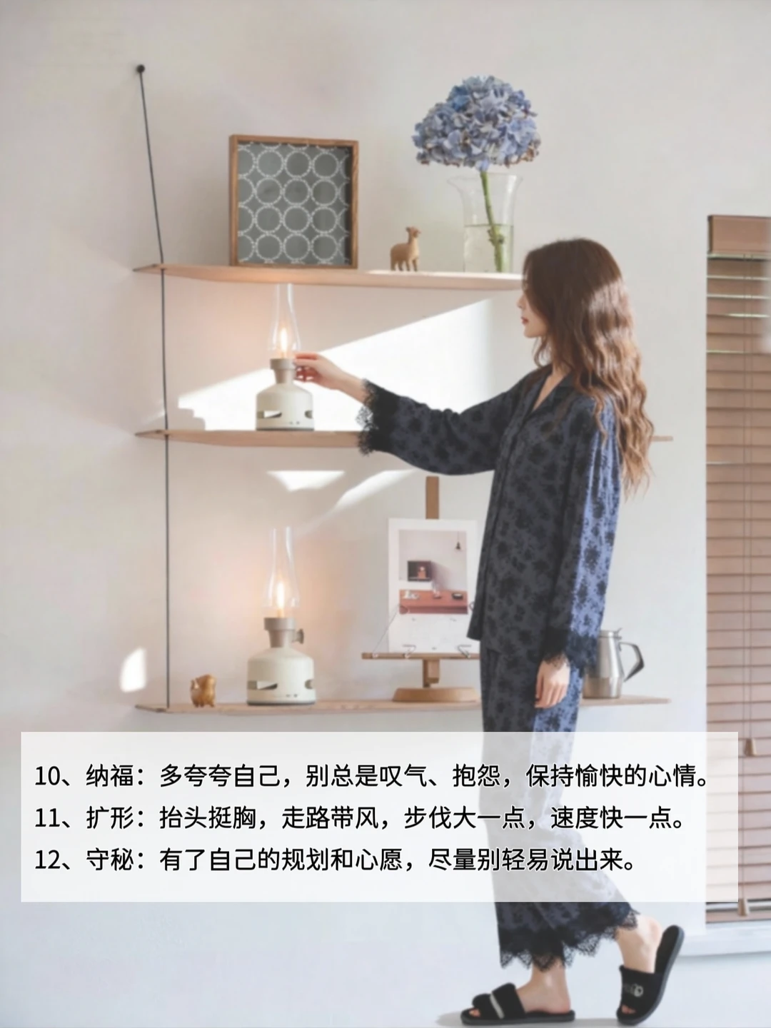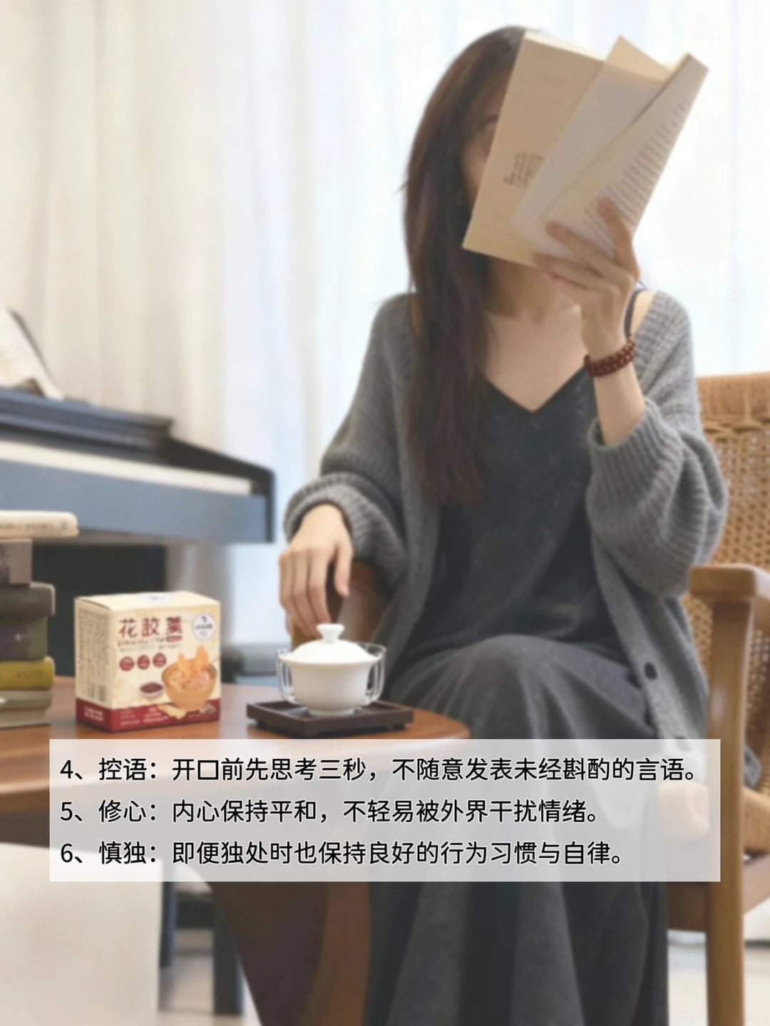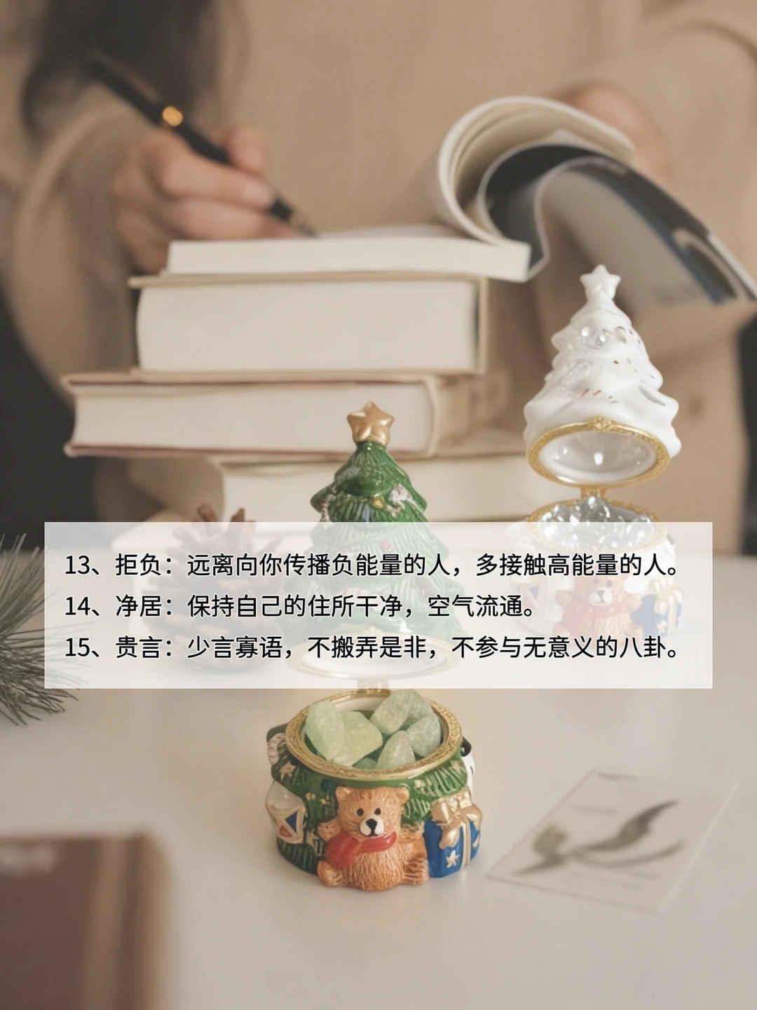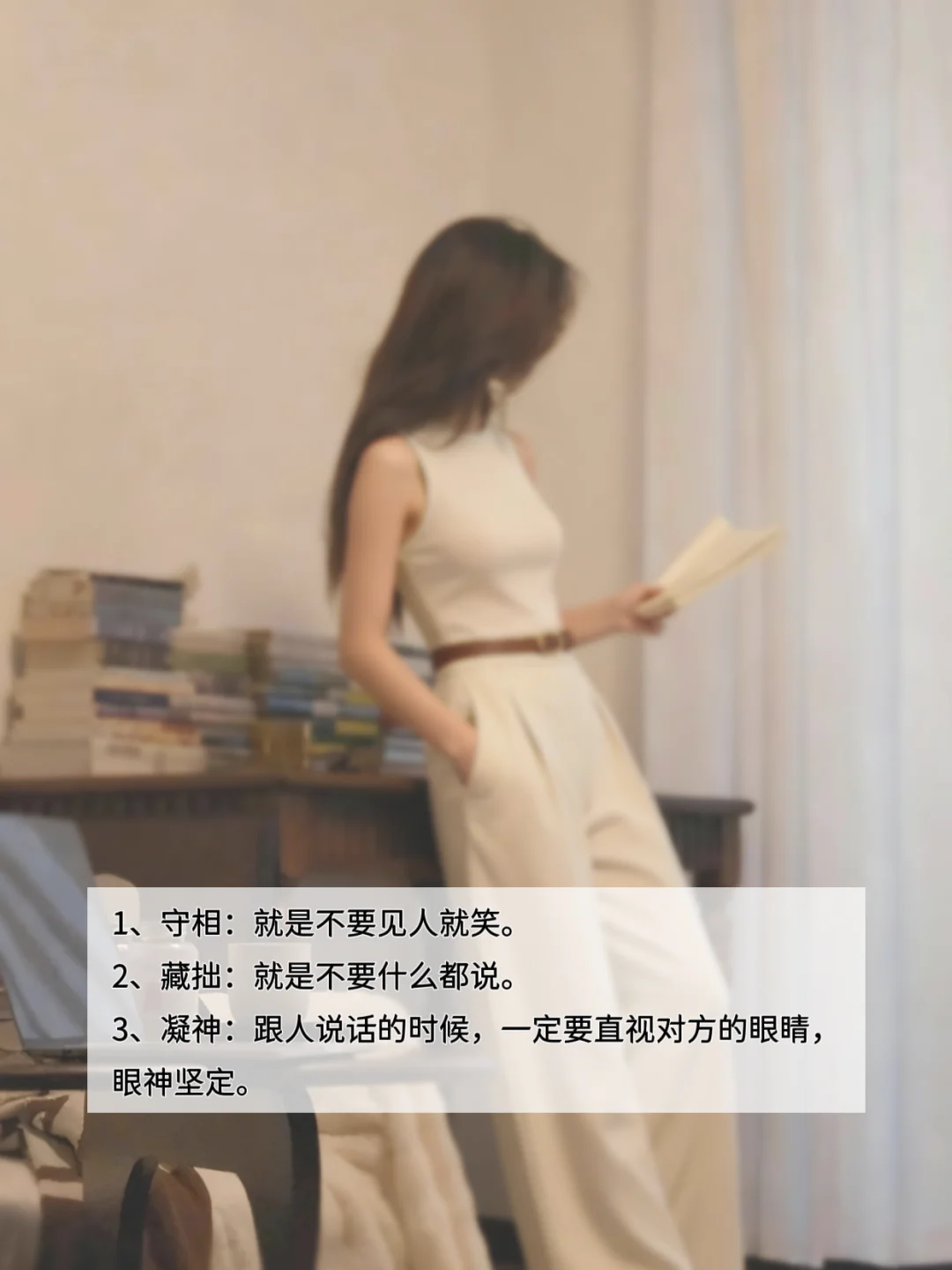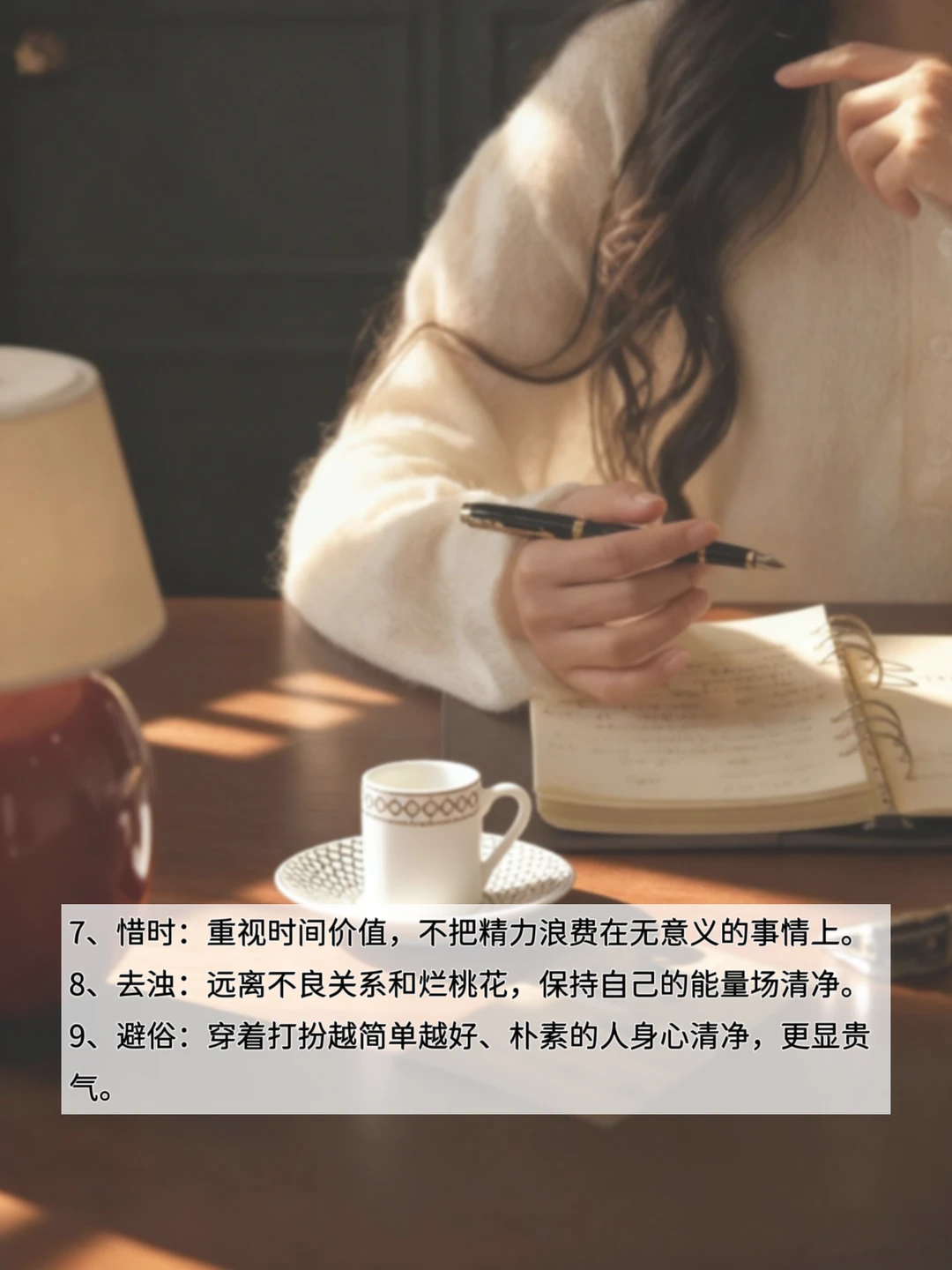1、守相:就是不要见人就笑。 2、藏拙:就是不要什么都说。 3、凝神:跟人说话的时候,一定要直视对方的眼睛,眼神坚定。 4、控语:开口前先思考三秒,不随意发表未经斟酌的言语。 5、修心:内心保持平和,不轻易被外界干扰情绪。 6、慎独:即便独处时也保持良好的行为习惯与自律。 7、惜时:重视时间价值,不把精力浪费在无意义的事情上。 8、去浊:远离不良关系和烂桃花,保持自己的能量场清净。 9、避俗:穿着打扮越简单越好、朴素的人身心清净,更显贵气。 10、纳福:多夸夸自己,别总是叹气、抱怨,保持愉快的心情。 11、扩形:抬头挺胸,走路带风,步伐大一点,速度快一点。 12、守秘:有了自己的规划和心愿,尽量别轻易说出来。 13、拒负:远离向你传播负能量的人,多接触高能量的人。 14、净居:保持自己的住所干净,空气流通。 15.贵言:少言寡语,不搬弄是非,不参与无意义的八卦。