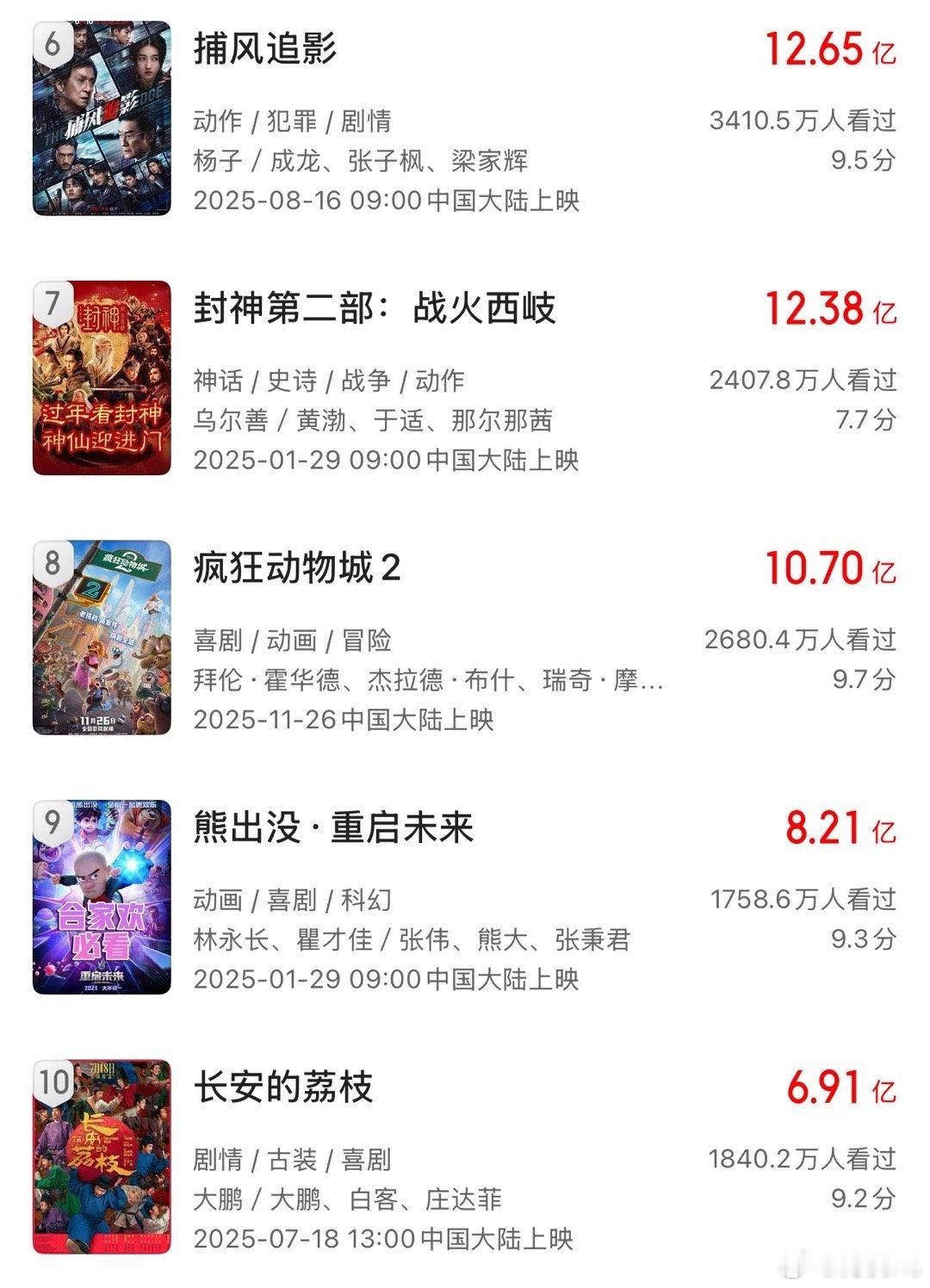 今年目前为止票房前十已经有四部动画片了,《哪吒之魔童闹海》《浪浪山小妖怪》《疯狂动物城2》《熊出没重启未来》