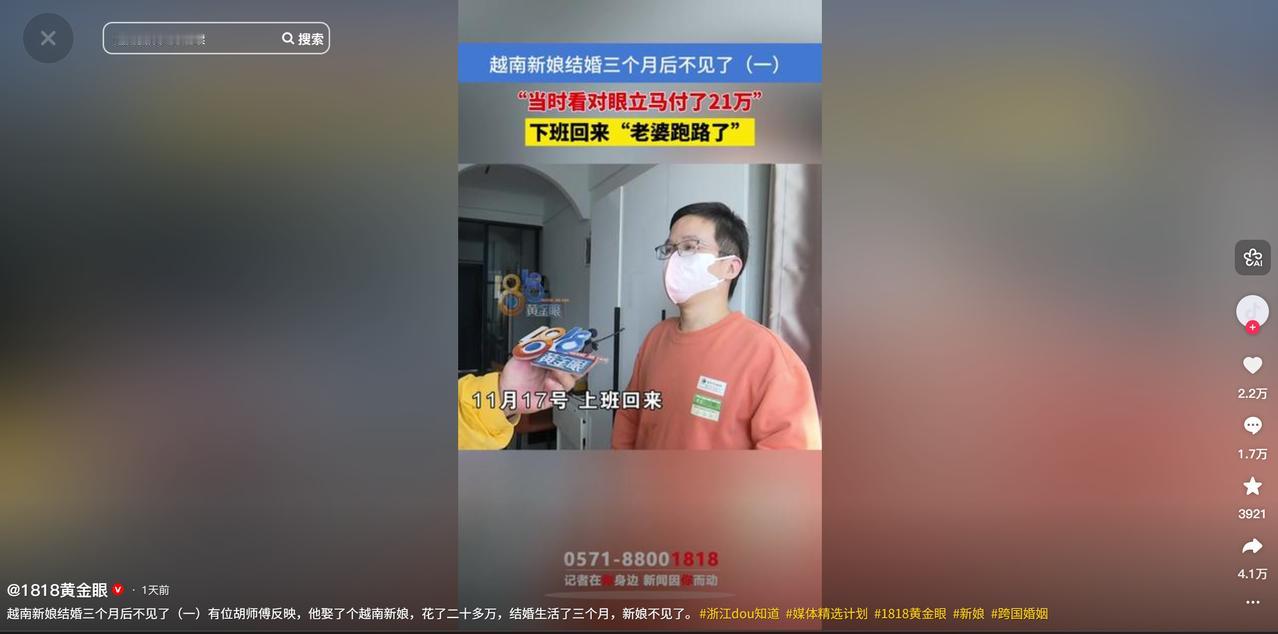 浙江杭州,40多岁的男子看到老乡娶了一个越南妻子,又带了一个20多岁的越南女子回来,要找丈夫,男子和这个女子对上眼了,男子爽快地给老乡夫妻21万,娶了这个女子,两人生活在一起,生活和睦,可是3个月后,男子下班回来,他的妻子跑了。 在浙江杭州打拼多年的胡先生,今年四十好几单身了大半辈子,他踏实肯干每个月能挣一万多块,手里慢慢攒下了些积蓄,日子不算富裕但也安稳,唯一的遗憾就是身边没个知冷知热的人。 看着同龄人大多成家立业,孩子都能打酱油了,胡先生心里也挺着急,总盼着能找个靠谱的人,组建一个简单的家庭。 转机来自表姐夫提起的一个老乡,那个老乡在杭州待了不少年,前段时间娶了个越南妻子,两人日子过得挺和睦,老乡逢人就夸媳妇勤快懂事,没过多久表姐夫又带来消息,说那个老乡家里来了个年轻的越南姑娘,才二十出头是他妻子的熟人,想来杭州找个踏实的人过日子,表姐夫觉得这姑娘看着本分,跟胡先生挺合适,就撮合着两人见了面。 见面那天胡先生心里挺忐忑,没想到一见到姑娘,就觉得挺对眼,姑娘眉眼清秀,性格安安静静的,虽然普通话不太流利,但待人接物透着一股实在劲儿。而姑娘看胡先生为人稳重,说话也温和,心里也有了好感,两人没太多花哨的相处,聊了几次后,都觉得对方是能过日子的人。 胡先生是个实在人,觉得既然双方都满意,就该痛痛快快把事儿定下来,老乡那边提了彩礼和相关手续的费用,再加上给老乡夫妻的辛苦费,前前后后一共要 21 万。 这笔钱是胡先生大半辈子的血汗钱,说不心疼是假的,但一想到能有个完整的家,他还是咬了咬牙,爽快地把钱给了老乡,没过多久两人就顺利领了结婚证,正式成了夫妻。 婚后的三个月,是胡先生这些年最舒心的日子,姑娘虽然因为语言不通没法出去工作,但把家里打理得井井有条,每天胡先生下班回到家,桌上总能摆好热腾腾的两菜一汤,味道做得十分对胃口。 两人交流虽然有些费劲,大多时候靠手势和简单的词语,但那种互相照顾的温馨劲儿,让胡先生觉得自己终于有了归宿,他把每个月的工资都交给妻子管,家里的大小事也多听妻子的意见,还悄悄规划着,以后条件再好点,说不定能生个孩子日子就更圆满了。 那段时间胡先生每天上班都干劲十足,心里揣着对未来的期盼,觉得所有的辛苦都值了,他甚至跟身边几个要好的朋友分享喜悦,说自己总算娶到了好媳妇,朋友们看着他满脸的幸福,也都真心为他高兴。 可胡先生没注意到,一些细微的隐患早已存在,姑娘平时总爱抱着手机,用越南文跟人聊天,有时候聊得挺投入,胡先生问起时,她只笑着说是 “哥哥” 或者老乡。 胡先生当时没多想,只当是她在跟家乡的亲友联系,有一次胡先生刷短视频时,看到有越南新娘婚后跑路的新闻,心里有点发慌就随手转给姑娘看,想提醒她好好过日子,没想到姑娘看了之后脸色立马沉了下来,好几天都没怎么理他,胡先生还以为是自己让她不高兴了,特意哄了好一阵子。 11 月中旬的一天,胡先生像往常一样下班回家,推开家门时,屋里黑漆漆的,没有像往常那样亮起灯,也没有饭菜的香味,他心里咯噔一下,赶紧打开灯,只见家里收拾得干干净净,姑娘的行李和平时常用的东西都不见了,那一刻胡先生脑子一片空白,愣在原地好久都没反应过来。 他疯了似的在屋里翻找,希望能找到一点线索,可什么都没有,他赶紧跑到小区保安室问情况,保安说没注意到有陌生车辆接人,也没看到姑娘单独出去。 胡先生又急急忙忙联系当初撮合的老乡,可老乡的态度却变了,不再像之前那样热情,只说这是他们夫妻之间的事,还找了些莫名其妙的理由,说可能是胡先生哪里做得不好,让姑娘受了委屈。 胡先生这才反应过来,自己可能是被骗了,那个所谓的 “哥哥”,说不定就是早就安排好的接应,这三个月的和睦生活,或许从一开始就是一场精心设计的骗局,21 万那是他省吃俭用攒下来的全部身家,就这么打了水漂。 这件事他不敢大张旗鼓地说,怕被人笑话是冤大头,家里的老父母知道后,气得当场病倒,一边骂他糊涂,一边又心疼他的血汗钱,胡先生想去报案,可警察看了结婚证,说这属于婚姻家庭纠纷,得去法院起诉,可现在人都找不到,连传票都没法送起诉也无从谈起。 如今的胡先生每天回到空荡荡的房子里,看着曾经两人一起吃饭的桌子,心里满是悔恨,工作也没心思干,频频出错被领导批评,表姐夫后来还说要再给他介绍对象,可他现在是一朝被蛇咬,十年怕井绳,别说相亲了连提婚姻都觉得害怕。他常常一个人坐着发呆,心里只剩一个念头,当初真不该贪这个 “便宜”,要是找个本地的踏实过日子,也不会落到今天这个地步。 (信息来源:1818黄金眼 2025年11月28日)