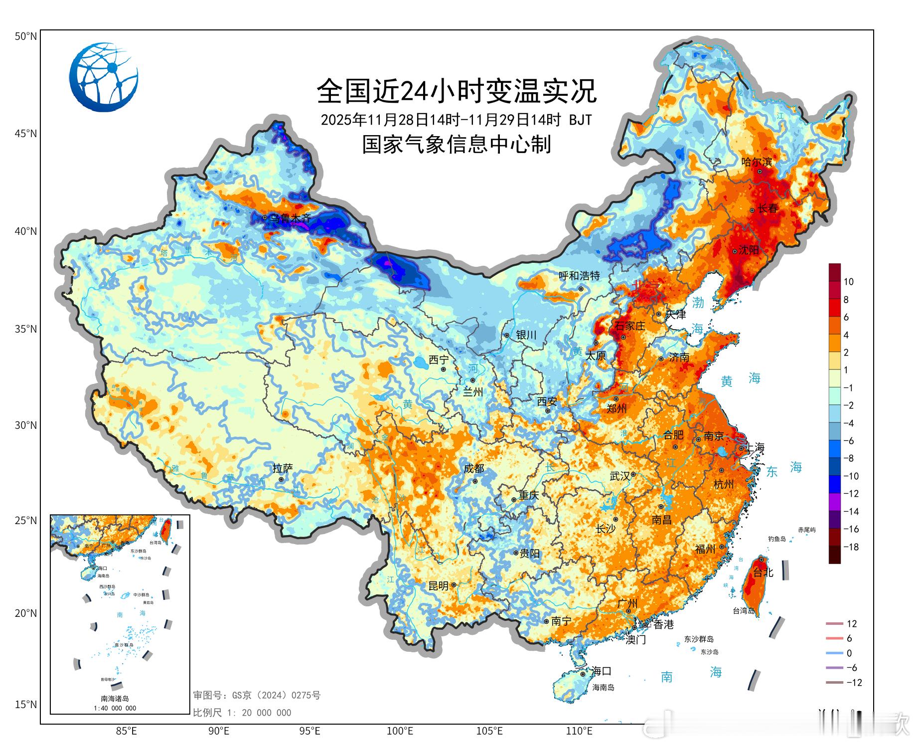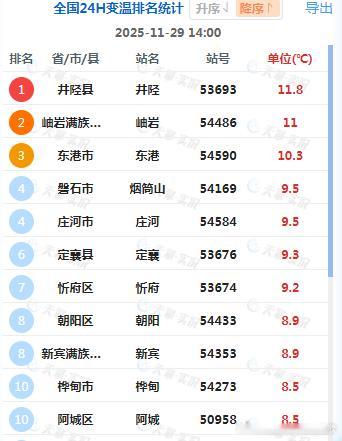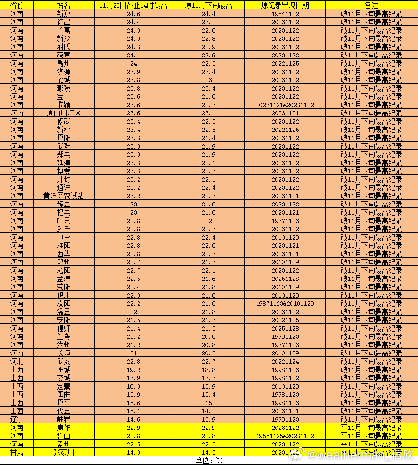 【气温】今天冷空气导致新疆、内蒙古等地出现降温。新疆木垒降12℃,为14时全国降温最强站点。而中东部多地气温回升,东北以及太行附近升温明显,河北井陉升11.8℃、辽宁岫岩升11℃,吉林烟囱山升9.5℃、山西定襄升9.3℃、黑龙江阿城升8.5℃,为各自省份14时升温最强站点。今天下午,河北南部和河南多地冲上20℃,温暖程度同期少见。截至14时最高,河南河北山西辽宁有50站气温打破11月下旬最高纪录。比如河南许昌24.4℃、新乡24.3℃、济源23.9℃、周口23.6℃、开封23.2℃、郑州22.7℃、河北武安22.8℃、山西阳城19.2℃、辽宁岫岩14.6℃。