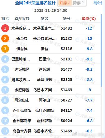 【气温】今天冷空气导致新疆、内蒙古等地出现降温。新疆木垒降12℃,为14时全国降