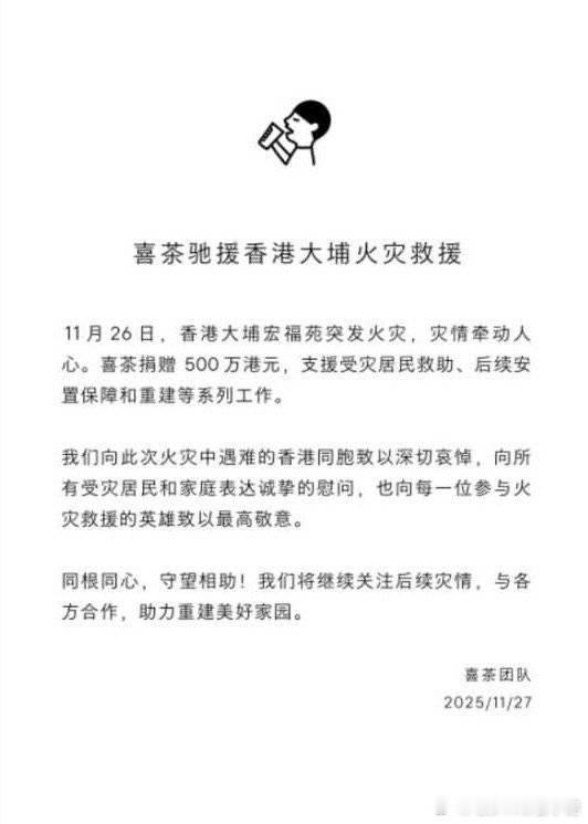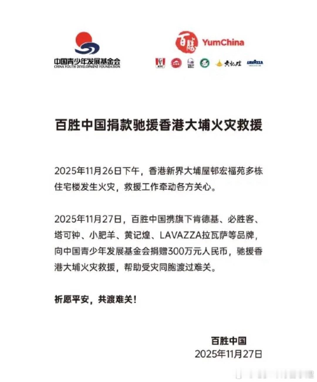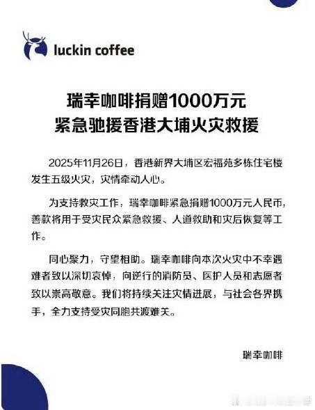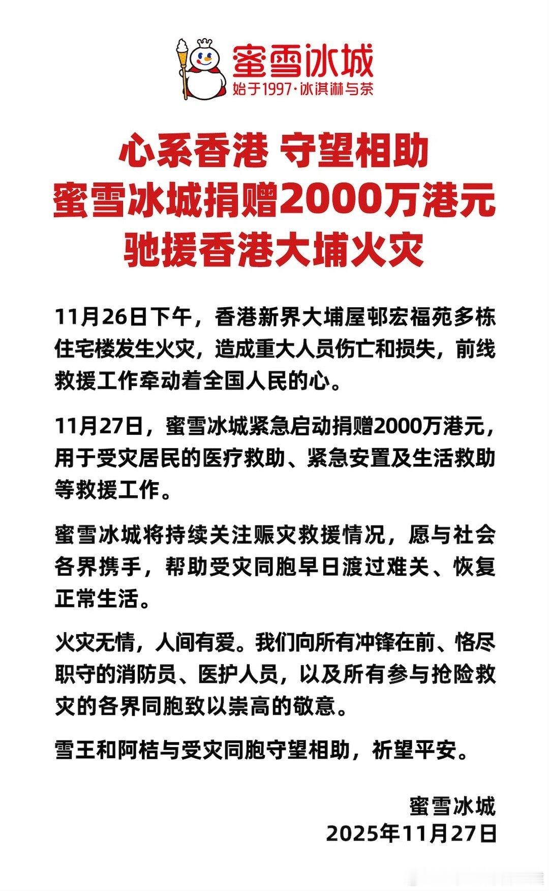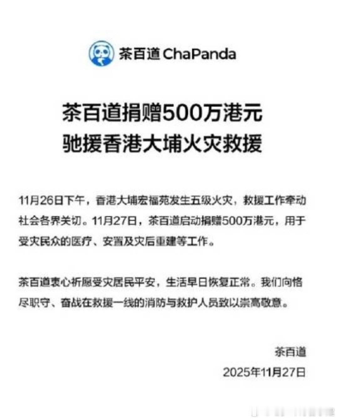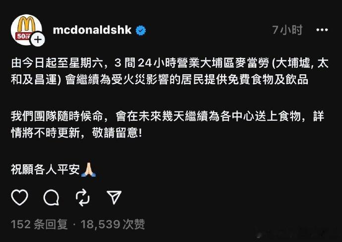 麦当劳香港大埔三间分店将会为受火灾影响的居民五个中心提供免费食物及饮品。蜜雪冰城宣布为香港大埔火灾受灾居民捐资2000万港币 茶百道宣布捐资500万港币驰援香港大埔受灾群众瑞幸咖啡宣布捐资1000万驰援香港大埔受灾居民百胜中国宣布捐资300万驰援香港大埔受灾居民喜茶宣布捐资500万驰援香港大埔受灾居民