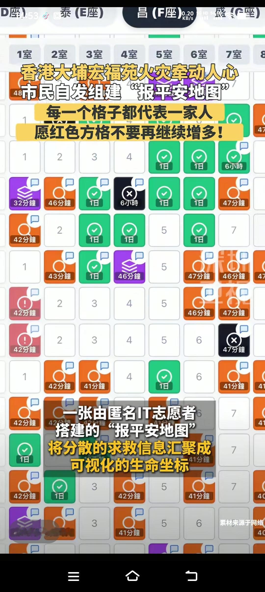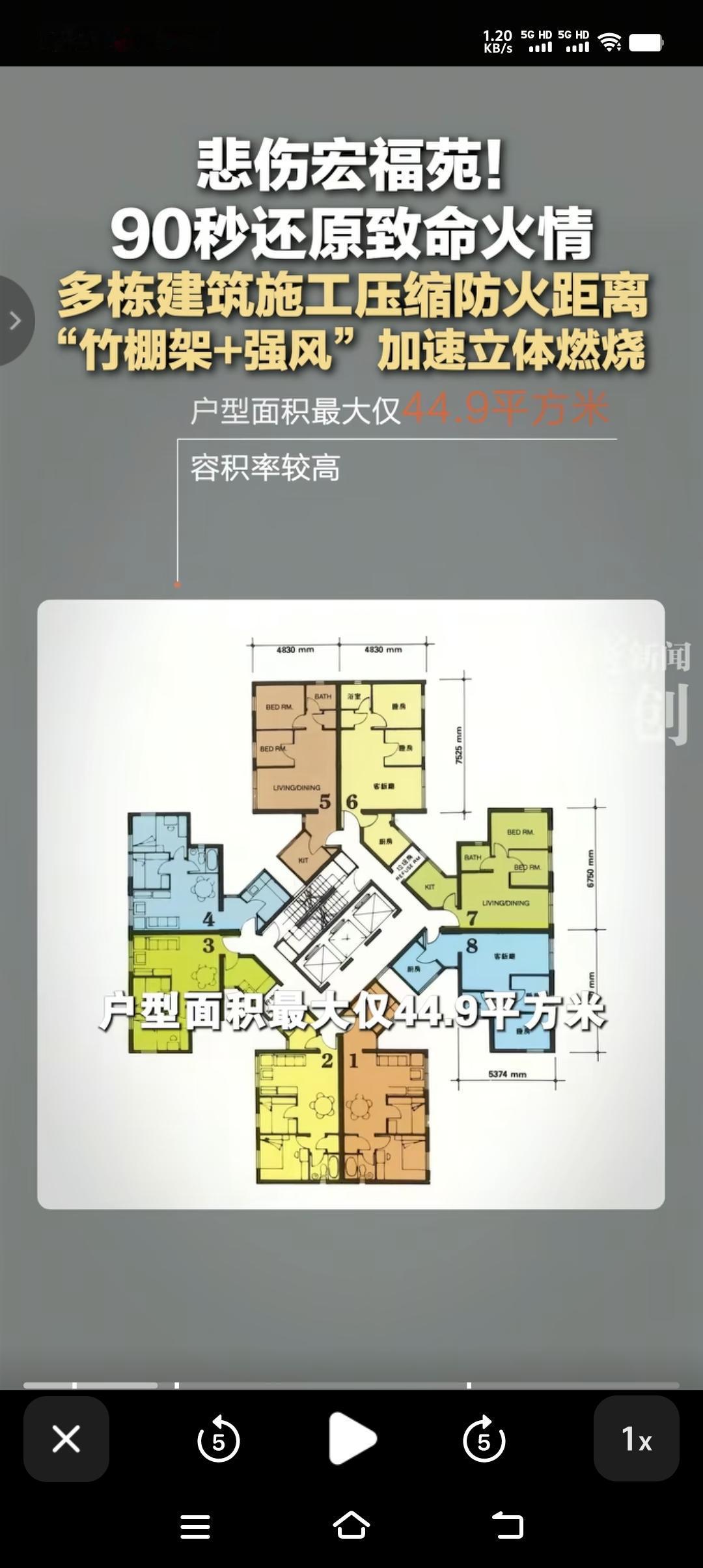 宏福宛有八栋高楼,每栋高楼都有一个寓意深远的名字,代表不同楼栋的特色,依次是宏仁阁、宏道阁、宏新阁、宏建阁、宏泰阁、宏昌阁、宏盛阁、宏志阁。宏昌阁最先起火,接着是其它七栋起火,宏昌阁和宏泰阁这两栋是烧的最厉害的,当然也是伤亡最多的。只有宏志阁在这次大火中安然无恙,与其说是幸运,不如说是奇迹,最好的解释就是风向问题。 总高31层,每层八户,可以说是人口相对密集,家家户户都像住在一个笼子里似的。最大面积仅44.9平方,可想而知这么小的房子,一旦发生火灾,想找一个安全的地方也不好找。如果没有一定的安全意识,很有可能被烧死或呛死。香港一座高度繁荣的国际大都市,这样的住宅确实让人堪忧。