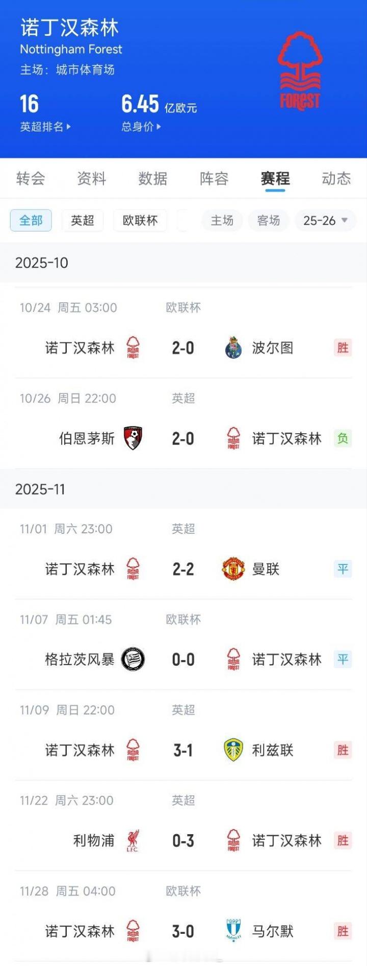 换帅如换刀⚔️森林近3场欧联1球不失拿下7分,击败波尔图和马尔默,战平格拉茨风暴。主帅戴奇上任之后,除了首场0-2不敌伯恩茅斯,随后便2胜1平砍下7分。这3场不败包括2-2曼联,3-1利兹联和3-0利物浦。如今他们逃离英超降级区,排名第16位。7场比赛4胜2平1负合计拿到14分,这对于森林来说,无异于脱胎换骨。要知道,戴奇的前任澳波上任39天,带队8场2平6负0胜绩,惨不忍睹。在戴奇的带领下,森林保不齐可以重现上赛季的黑马之姿。