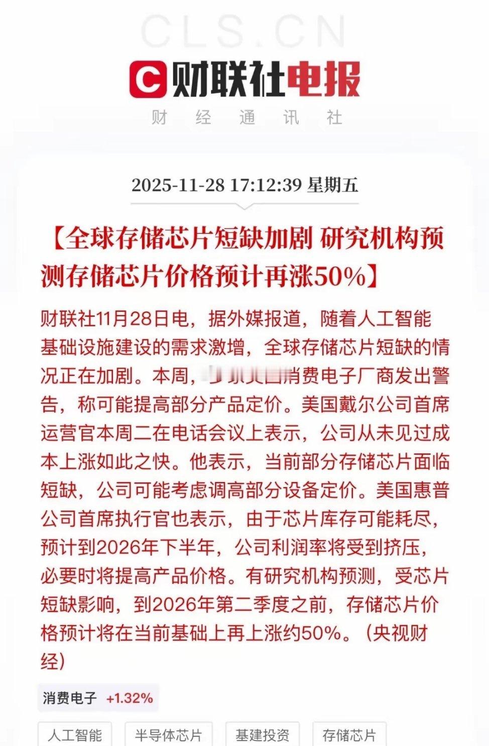 跨年方向是他?存储芯片再再涨价50%,会否成为跨年方向?快来看看吧!一、核心结论速览• 主因:AI算力需求激增致DRAM供不应求,叠加原厂控价与产能策略,价格暴涨。• 涨幅:今年累计约50%,机构预计2026年Q2前或再涨约50%。• 影响:手机、PC终端成本大增,厂商酝酿涨价,周五晚美股存储概念股走强。二、2025年涨价时间线(要点)• 上半年:AI需求带动,存储价格稳步上行,年中累计涨幅约50%。• 9月:闪迪率先涨价;美光暂停DDR4/DDR5报价,计划一周内涨20%-30%;三星通知大客户Q4 DRAM涨15%-30%、NAND涨5%-10%。• 10月:OpenAI“星际之门”推高存储需求;SK海力士通知Q4 DRAM/NAND最高涨30%;原厂暂停报价引发囤货,DDR5 16Gb颗粒单月涨102%(9月底7.68美元→10月底15.5美元)。• 11月:512GB存储较上月涨近500元;手机厂商暂停采购;戴尔、惠普预警涨价;机构称Q4 DRAM合约价同比涨逾75%;SK海力士称2026年订单已售罄。三、关键影响与市场表现• 产业链:原厂强势,进入“竞价模式”,买家需高价获产能;下游终端成本大增,手机、PC将迎涨价潮。• 市场:美股存储概念股走强,闪迪、美光、西部数据集体上涨;现货市场价格波动剧烈,部分产品溢价**20%**仍供不应求。四、后续展望• 机构预计涨价延续至2026年Q2,之后或再涨约50%。• 终端厂商加速备货与适配国产存储,以缓解成本与供应压力。大家要知道存储芯片是进入到了超级涨价周期,这个周期会延续到明年一季度,所以这个方向后续还会继续出涨价的利好,因为目前芯片短缺非常严重,一天一个价格!所以这条线或许会成为下个月主要热点方向存储芯片的环节涉及到:设计、材料、封测、销售。目前是销售端非常的好,例如海力士代售的香浓!你觉得存储芯片会成为跨年方向吗?存储芯片行情芯片股行情存储芯片概念股