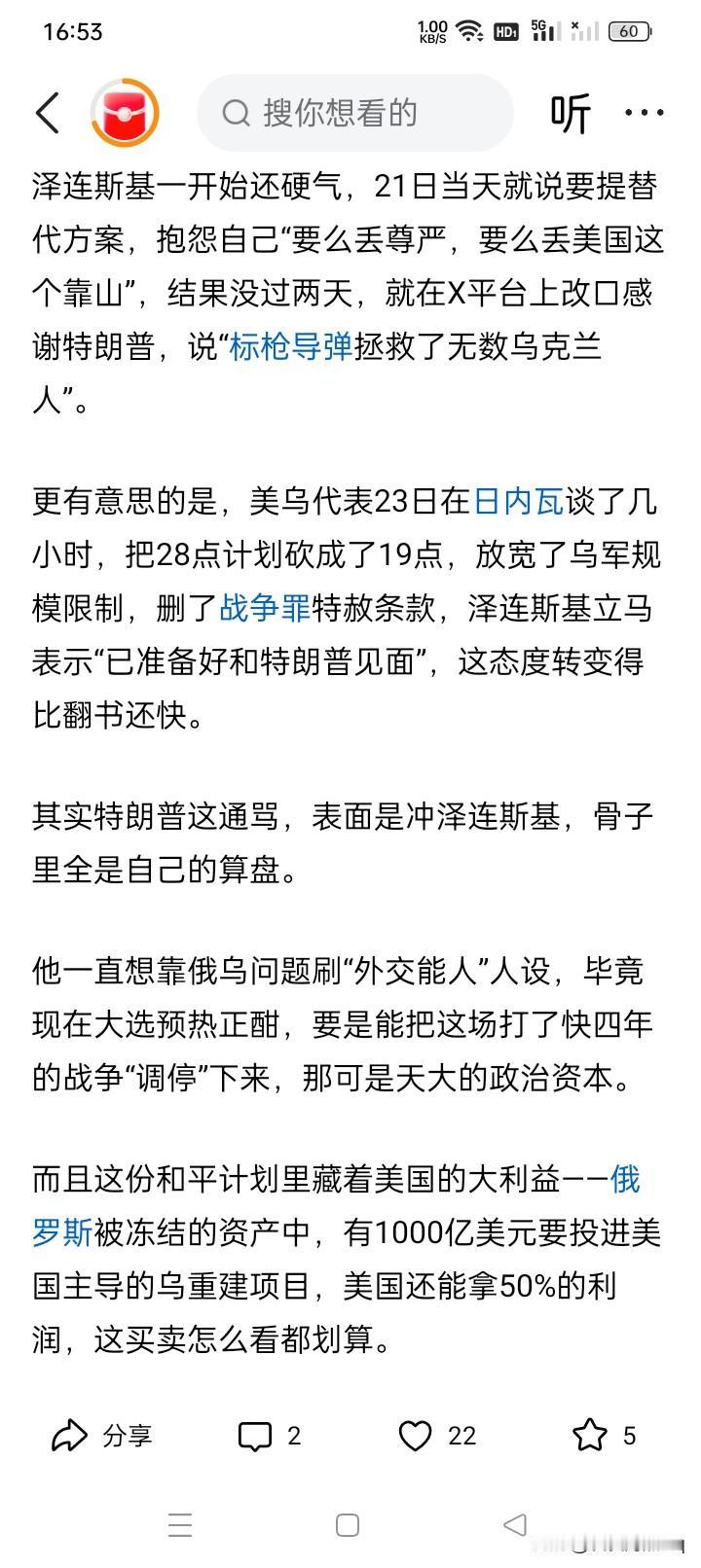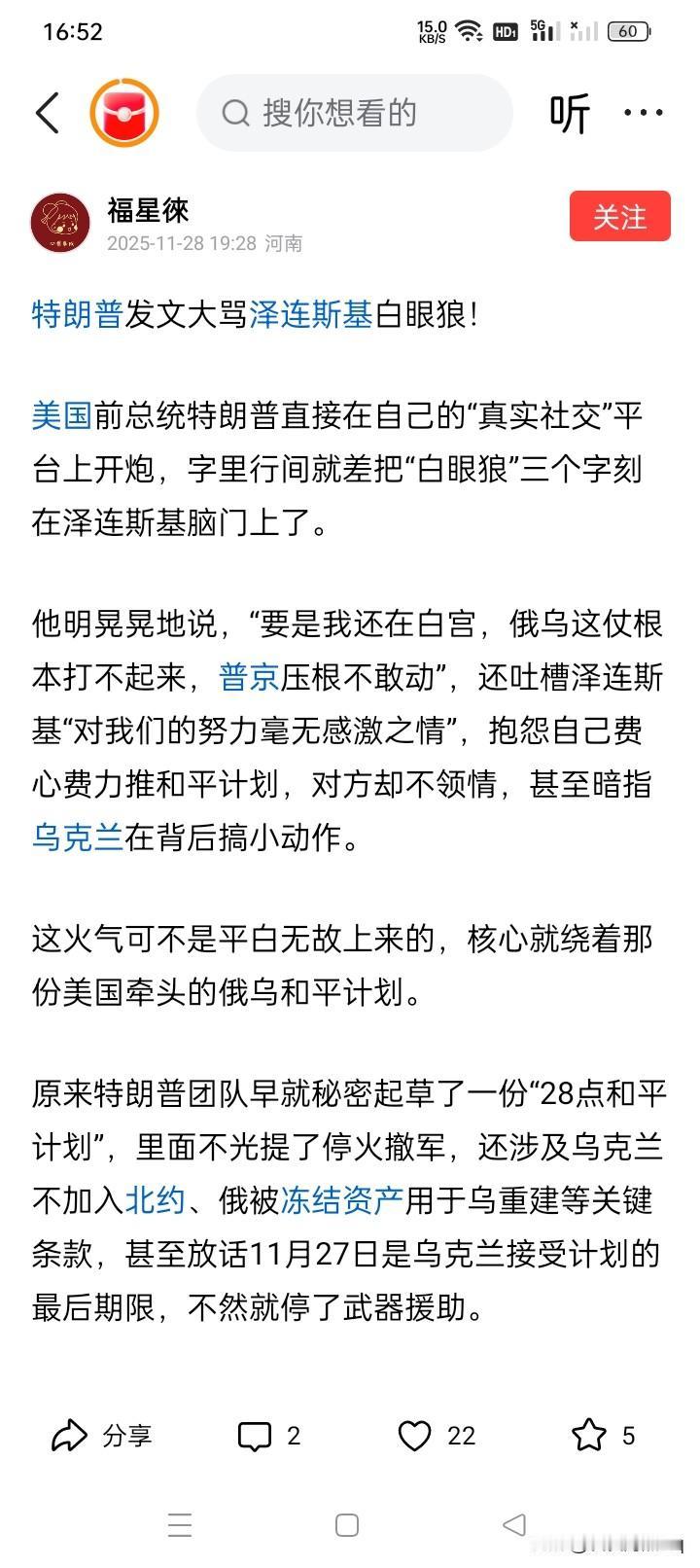别搞错了,这是好事而非坏事? 有人在网络上发文说:《特朗普大骂泽连斯基白眼狼!》。想来想去,感觉到这绝对是个好事,而万万不可能是个坏事。 首先要搞清楚,特朗普认为最大的对手在哪里、是谁,如果不出预料之外的话,应该就是东方大国。因为那个发动战争的国家,在战争的三年多、马上就四年的时间里,已经充分暴露了他的所有的军事力量的底细,就是并不怎么样。美国人现在清清楚楚,他们的军事力量根本就不足为虑,为虑的不是他们,而是东方大国。 特朗普恼羞成怒的是,乌克兰不听招呼,不愿作为他的一个棋子,为共同对付东方大国而不惜牺牲自己的国家领土和主权完整的利益。 特朗普非常清楚,发动战争的国家,连个乌克兰都不能轻易打败,可想他的武装力量的能力可能十分有限,甚至是微不足道。未来只能是作为美国的附庸而存在,所以要尽可能的拉拢、甚至是让步于他,然后,才有可能一致对付东方大国。 因此,没有任何必要指责乌克兰,或指责乌克兰总统泽连斯基。他们好像无非就是不愿做特朗普的过河卒子,牺牲自己,遂特朗普所愿而已。