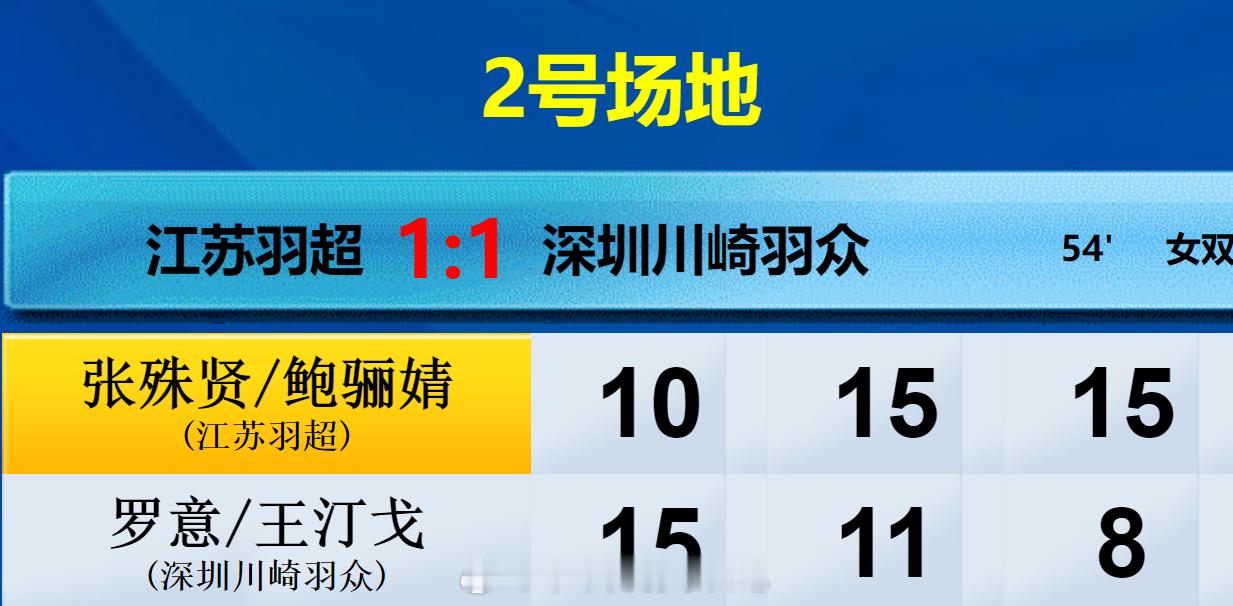 羽超联赛 江苏羽超 2-1 深圳羽众 混双 陈柏阳 鲍骊婧 12-15 15-11 8-15 陈俊廷 曹梓涵 女单 徐文婧 15-3 19-17 邬洛愉 女双 张殊贤 鲍骊婧 10-15 15-11 15-8 罗意 王汀戈 男单 刘宇轩 VS 孙飞翔 男双 孙文骏 徐满文天 VS 陈俊廷 刘峻荣 热点现场