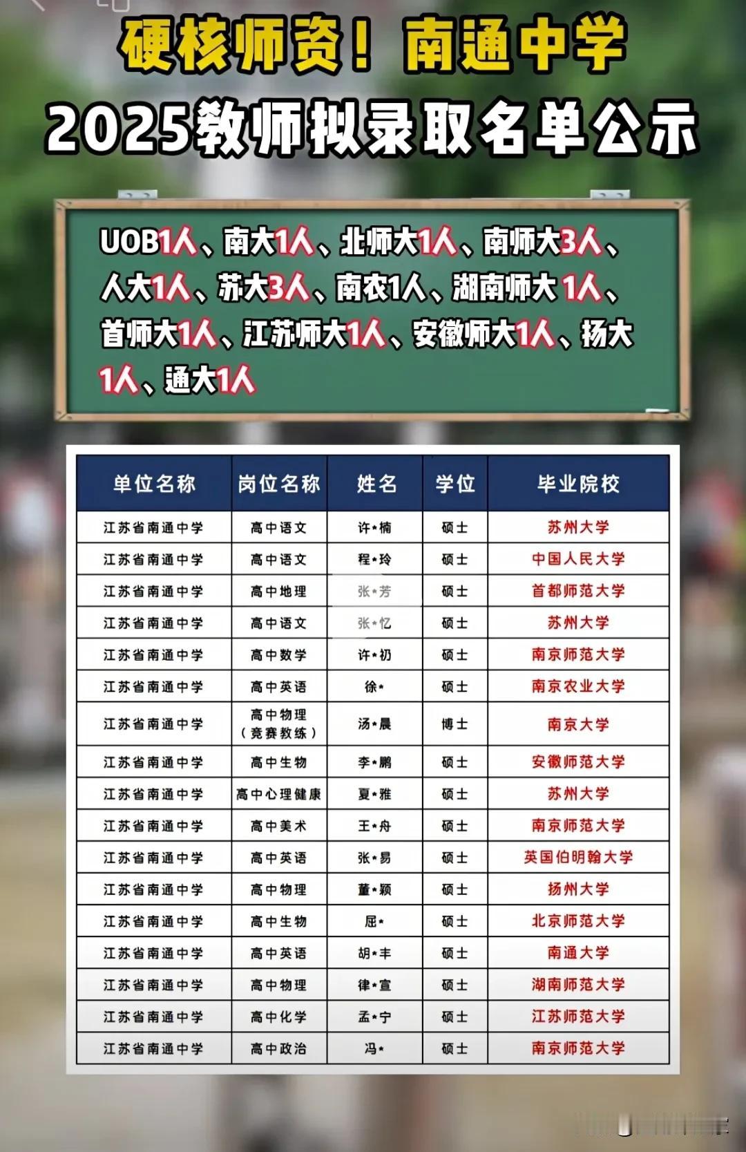 南通中学不愧是名校,招聘的教师全是硕士。 而且基本上都是211,985名校,次一点的也就是首都师范大学,安徽师范大学,南通大学。 这解释了为什么南通高考成绩厉害的原因之下,那就是师资够硬。并且这些被招聘的新教师也是通过层层笔试面试进来的。 所以如今这个时代,要想成为一名老师。跟10年前,20年前比那简直天差地别了。南通中学的师资水平在十三太保中,不输南京苏州。