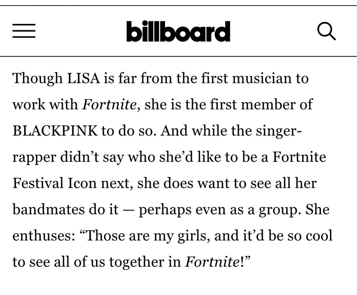 格局:LISA透露她希望看到所有成员或BLACKPINK以组合形式成为《堡垒之夜》音乐节图标!“她们是我的女孩们,能让我们全员一起出现在《堡垒之夜》里真的太酷了!”