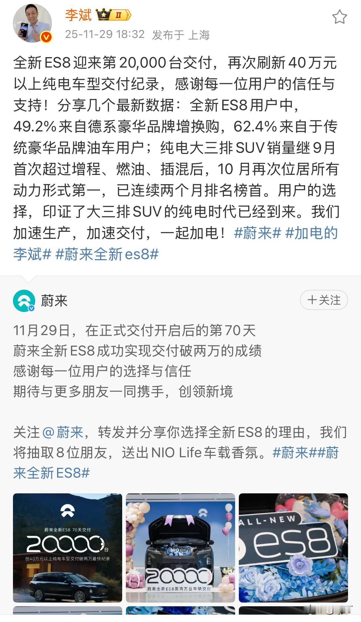 李斌:今天ES8迎来第20,000台交付,再次刷新40万元以上纯电车型交付纪录。