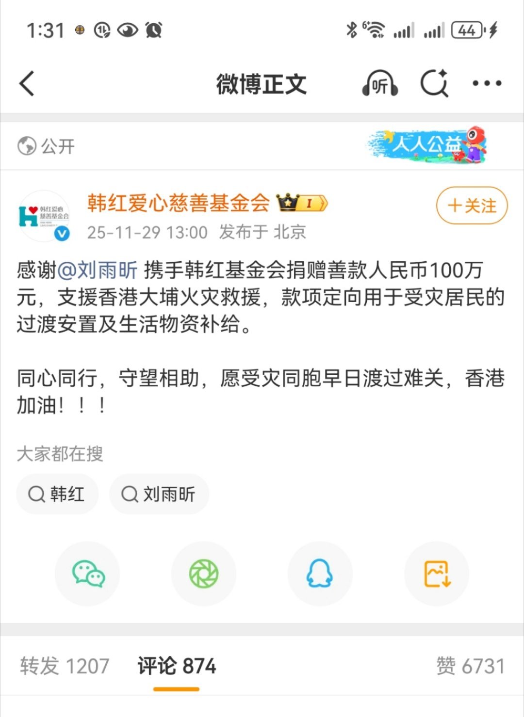 刘雨昕向香港捐赠100万元人民币🙏愿同胞平安! 刘姐公益道路也从不缺席正能量偶