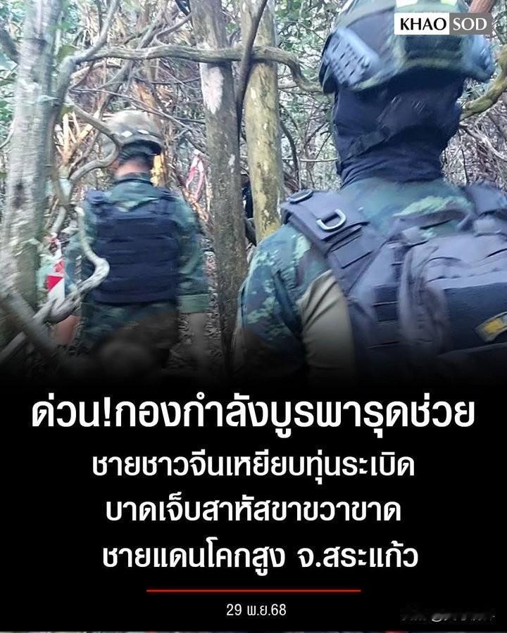 2025年11月29日,泰国军队第一军区通过第一军区作战中心收到来自布拉帕特遣队的报告,称有人非法越境进入泰国境内,在Ban Nong Chan地区踩到地雷,导致受伤。 当地时间凌晨5点,边境巡逻警察(BPP)第四特种作战连的警员听到距离四番路约80-90米的灌木丛中传来爆炸声。他们立刻派遣了一架无人机前往现场进行检查。无人机发现中国男子,他疑似踩到地雷受了伤,并用英语呼救。泰方排雷小组立即展开紧急救援行动,伤者被送往沙缴府郭城县郭城医院。 这名受伤人员26岁,来自中国云南省。右腿被切断,伤势严重。他到底是如何进入泰国境内,目前还在调查中。 Ban Nong Chan位于泰国沙缴府,靠近泰柬边境。该地区曾是1979年柬埔寨难民营的所在地,现为历史遗迹和泰柬两国边境发生争执的地方。