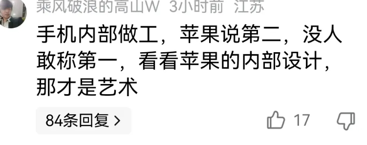 每次国产手机拆机图解一出,总有一些人说苹果内部设计,做工堪称艺术品。我就不明白了,国产手机这么多年了,主板集成度是不是越来越好,工艺是不是不以前好了。苹果为啥能大胆设计?销量支撑和摄像头分布。说白了,在很多零配件上,苹果可以有主动权,甚至可以要求怎么设计,还有摄像头多少代了,参数在变位置大小好像没什么变化吧。在对比国产手机,大底主摄,潜望长焦,好像发布一次就会变一次吧。 然后,还想问一下,苹果设计这么优秀,这个信号怎么一直没解决呢?
