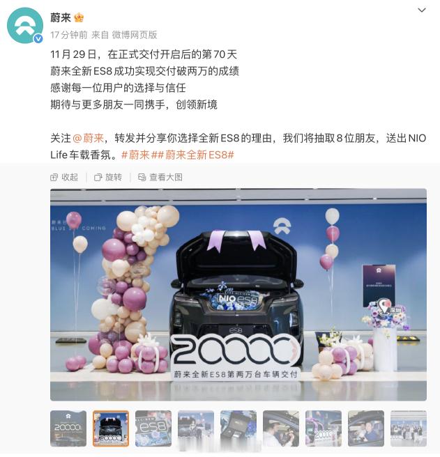 蔚来新 ES8 实现交付两万台的成绩。到目前为止,蔚来新 ES8,正式交付 70 天。308_IO新能源汽车蔚来