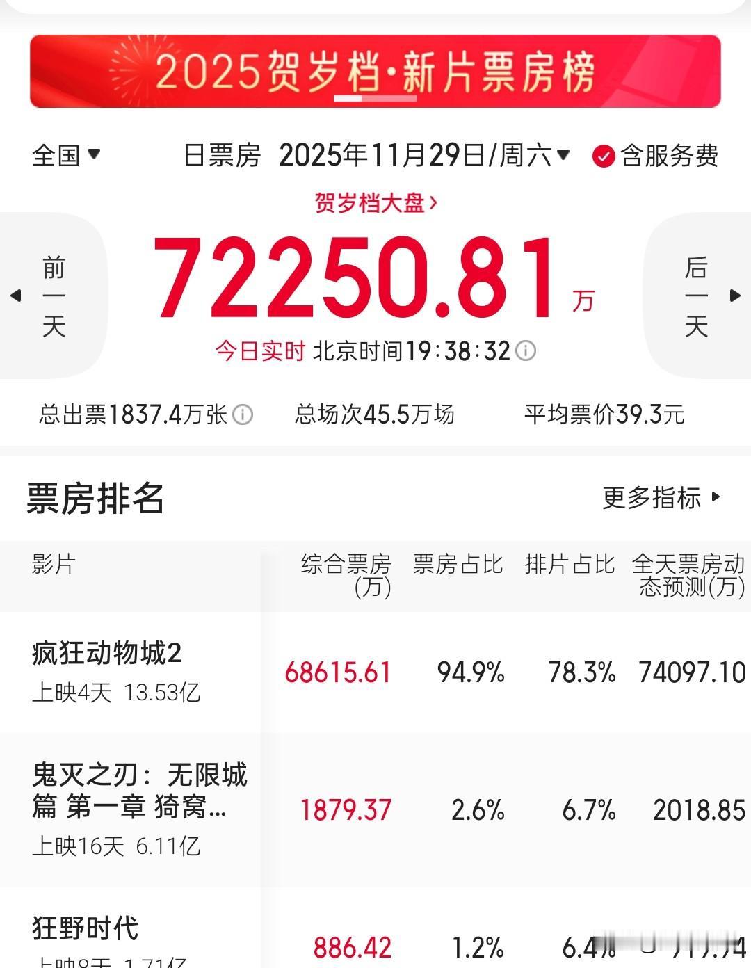 太猛了,这票房走势直接搅动了一池春水。 截止当前,今日《疯狂动物城2》的票房已达