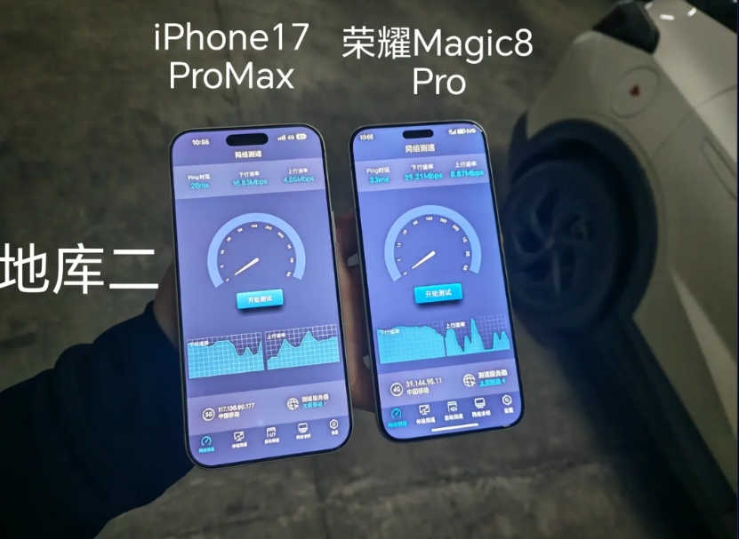 一直好奇今年iPhone17ProMax的信号咋样,今天拿荣耀Magic8 Pro和它做了个对比,在地库和电梯里面都做了测试,两张移动的卡,条件都一样。