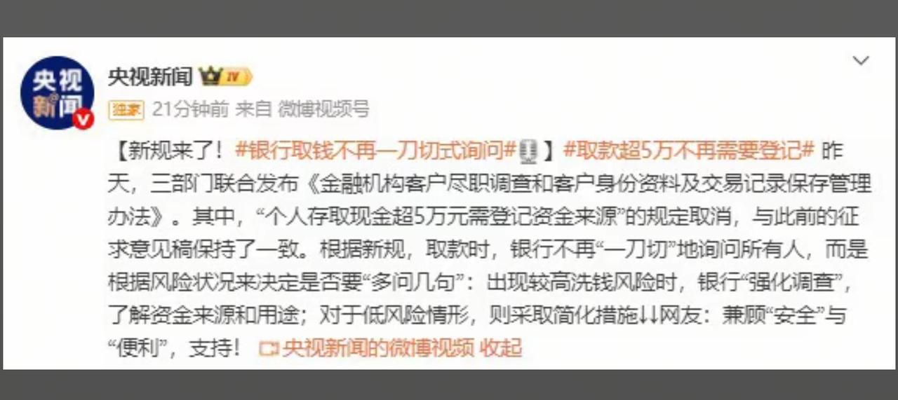 一个律师改变了银行规定,银行新规终于来了,5万元以下可以正常取款。 2026年1月开始正式实施,取款5万元不用登记资金来源,也不会在被询问其用途,可以凭卡正常办理,而所谓的正常询问,只在银行账户突然多出几笔较大金额,出现异常情况,这种个人认为还是非常有必要。 如果没有之前律师取款被盘问,导致事情发酵,可能这个规定还会迟到,所谓的民生问题难道只有到了满城皆知的时候,才会被重视吗。银行取钱新规定 取钱规则