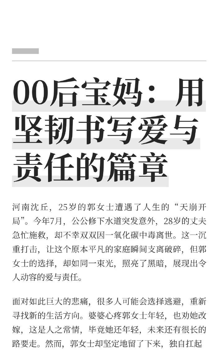 河南沈丘,25岁的郭女士遭遇了人生的“天崩开局”。今年7月,公公修下水道突发意外,28岁的丈夫急忙施救,却不幸双双因一氧化碳中毒离世。这一沉重打击,让这个原本平凡的家庭瞬间支离破碎,但郭女士的选择,却如同一束光,照亮了黑暗,展现出令人动容的爱与责任。 面对如此巨大的悲痛,很多人可能会选择逃避,重新寻找新的生活方向。婆婆心疼郭女士年轻,也劝她改嫁,这是人之常情,毕竟她还年轻,未来还有很长的路要走。然而,郭女士却坚定地留了下来,独自扛起了照顾婆婆和年仅2岁儿子的重担。她的理由朴实又深情:“我老公他什么都没有留下,只有一个孩子在这个世界上证明他来过,我不想让他唯一的儿子喊别人爸爸。”这短短几句话,饱含着对丈夫深深的爱和对家庭的责任感。在她心中,丈夫虽然离开了,但这个家不能散,她要守护着丈夫留下的血脉,让儿子在完整的家庭氛围中成长。 郭女士的坚韧不仅体现在她拒绝改嫁的决心上,更体现在她日常对婆婆和儿子的悉心照料中。婆婆说“她待我比亲闺女都好”,这简单的一句话,是对郭女士付出的高度认可。在生活的重重困难面前,她没有抱怨,没有退缩,而是用实际行动诠释着“长嫂如母”的担当。每到深夜,她给丈夫的手机发信息、打电话,仿佛丈夫从未离开,这一细节更是让人泪目。她以这种方式寄托着对丈夫的思念,同时也给自己加油打气,告诉自己要坚强地撑下去。 郭女士的故事,让我们看到了人性的美好和力量。在物欲横流的今天,很多人追求个人的幸福和利益,而她却把家庭的责任和爱放在了首位。她的选择,或许在有些人看来有些傻,但正是这份“傻”,让我们感受到了真情的珍贵和坚守的意义。 生活或许会给我们出难题,但只要我们心中有爱,有责任,就一定能像郭女士一样,在困境中挺直脊梁,书写属于自己的精彩人生。她的故事,也激励着我们在面对生活的挫折时,勇敢前行,用爱和责任守护我们身边的人。全网热点共创计划
