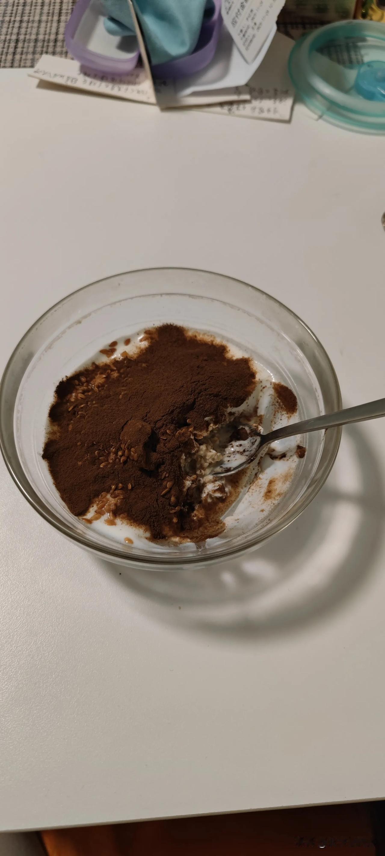 今天又来一碗脏乎乎的酸奶。中午吃完饭我就,从冰箱里取出酸奶把麦片泡上了。 一个是我不敢吃太凉的东西,再一个就是让酸奶慢慢的浸润麦片,口感会更好。临吃前撒上一小勺炒熟的亚麻籽和可可粉。 据说这是减肥餐,但是我觉得自己还不算肥,而且人老了还是应该有点肉。就是没事闲的想尝试一下酸奶的各种吃法。