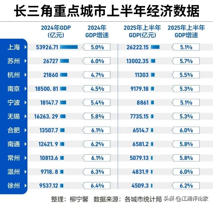 南通上半年经济数据超越合肥,GDP达到6581.2亿元,增速5.8%。在其后是常州,GDP为5079.13亿,增速也是5.8%。不过,南通离无锡还是差点距离,无锡7735.15亿元,领先比较多。 让人意外的是合肥,虽然今年上半年被南通超越,但是也不过是略微的弱势,全年GDP保持领先南通应该问题不大。因为合肥近年来的产业布局确实领先长三角的其他城市。 所以,你会发现原来在浙江、江苏打工的安徽人,现在不少都回流到了合肥。