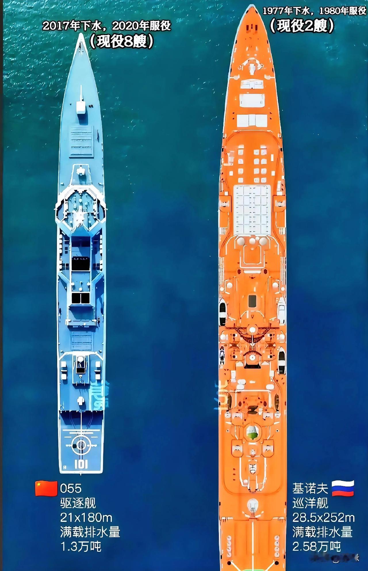 读高中的时候看《舰船知识》,特别羡慕俄罗斯有基洛夫巡洋舰,2.58万吨的排水量啊!零头都比我们最大的导弹驱逐舰哈尔滨号大了一圈。 现在看到我们的055万吨级大驱,再回头去看基洛夫级巡洋舰就觉得不过如此嘛!我们的055大驱排水量比基洛夫还是小很多,但两者如果单挑的话,基洛夫巡洋舰肯定不是我们的对手。