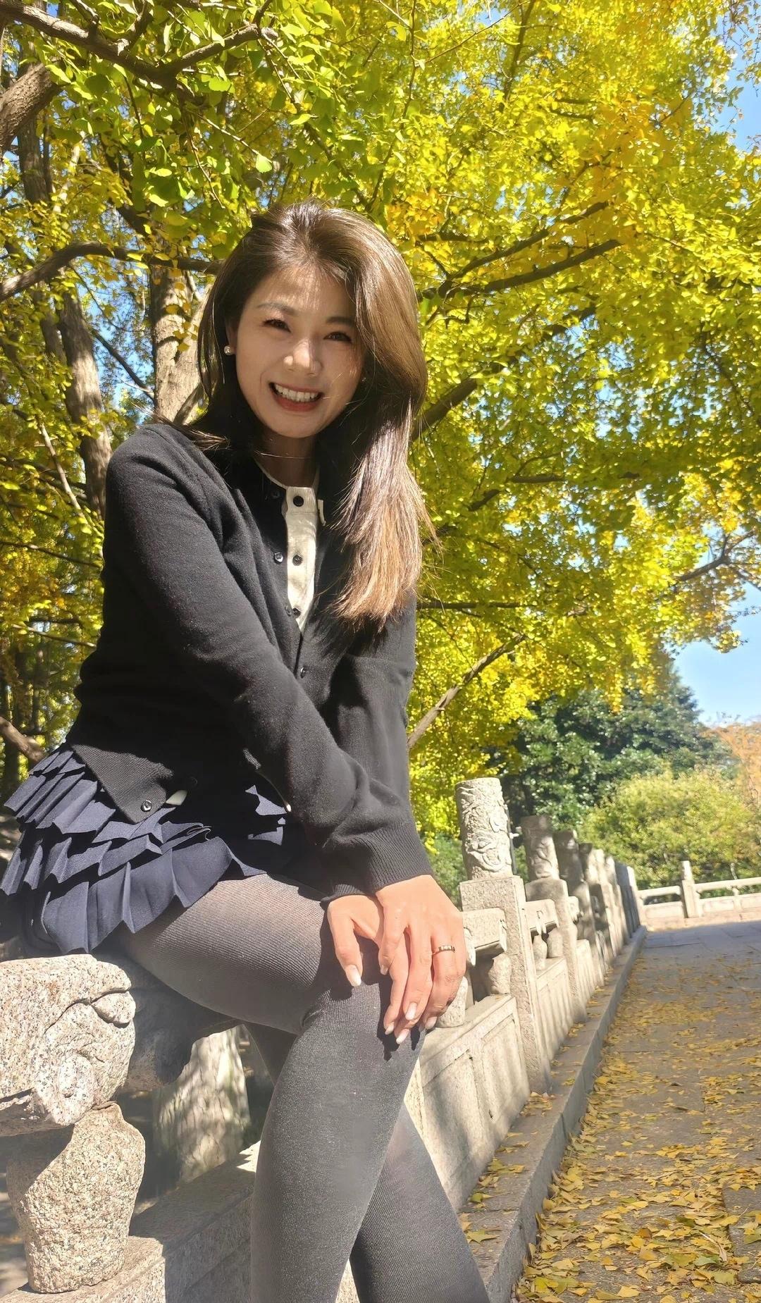 秋日暖阳下,笑靥如花的少女与金黄落叶相映成趣。