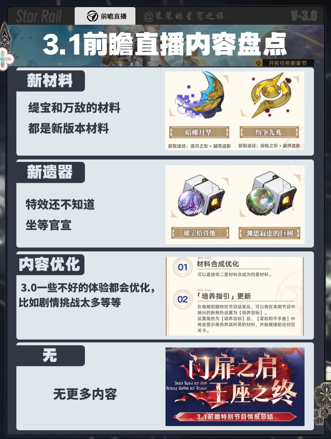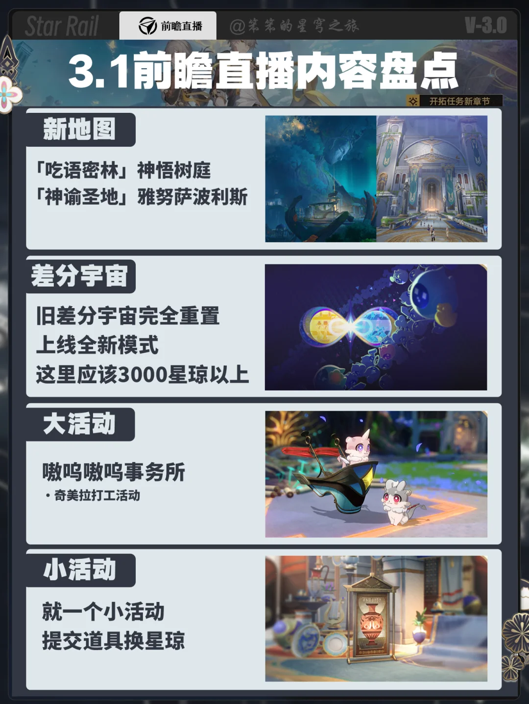 🐱大家好,我是笨笨的铲屎官 5.1的前瞻汇总来啦 ①卡池: 上半.缇宝(量子同谐),复刻云璃 下半.万敌(虚数毁灭),复刻霍霍 ②新内容/活动: 新差分宇宙 黑塔商店五星记忆光锥 巡星之旅(签到10抽) 嗷呜嗷呜事务所 圣城鉴宝 ③优化: 差分宇宙攻略系统 材料合成优化 主线任务流程优化