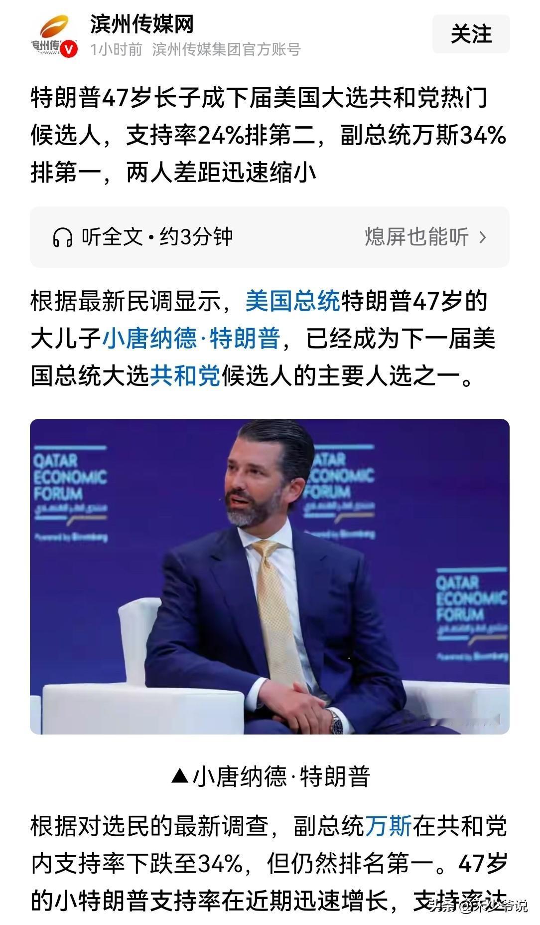 美国下一任总统之争,小特朗普与万斯不相上下 根据美国民调组织的最新民调,美国现任总统特朗普之子小唐纳德·特朗普的支持率已经超过了24%,而美国现任副总统的支持率为34%,也就是说共和党内部对于下一任总统的人选也在小特朗普与万斯之间摇摆。 如果说共和党支持小特朗普竞选下一届总统,那么万斯将失去竞选下一届美国总统的机会。
