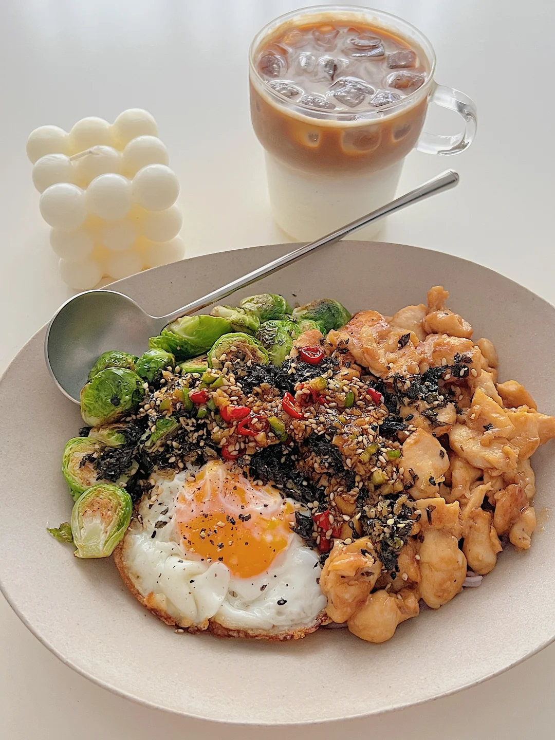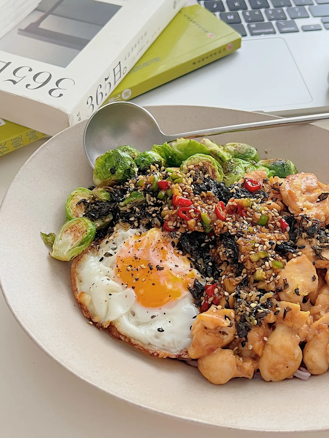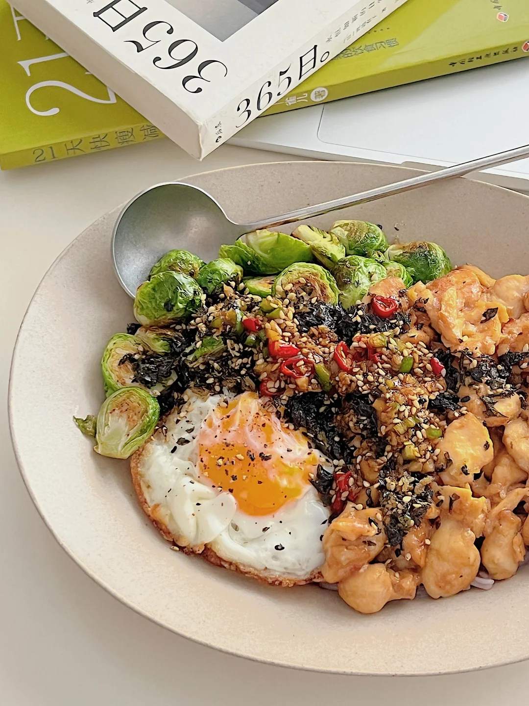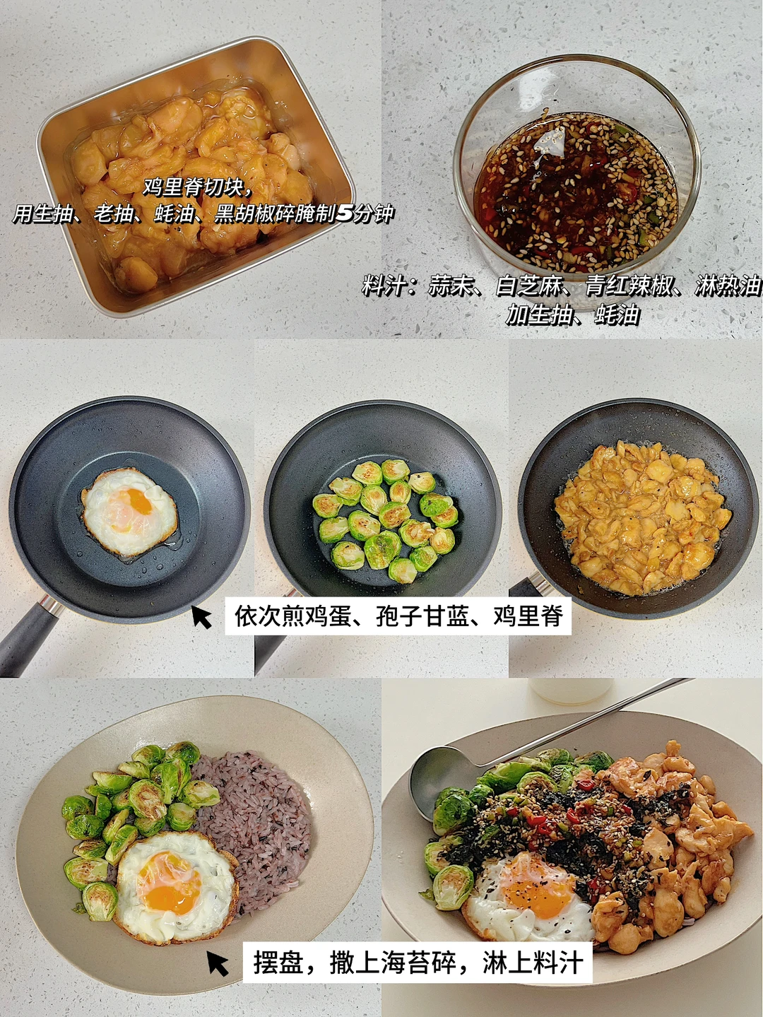 2️⃣平底锅三件套:先煎溏心蛋→再炒孢子甘蓝→最后煎鸡里脊