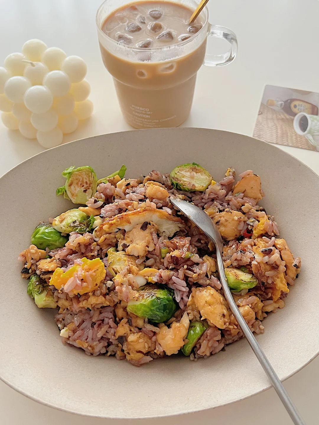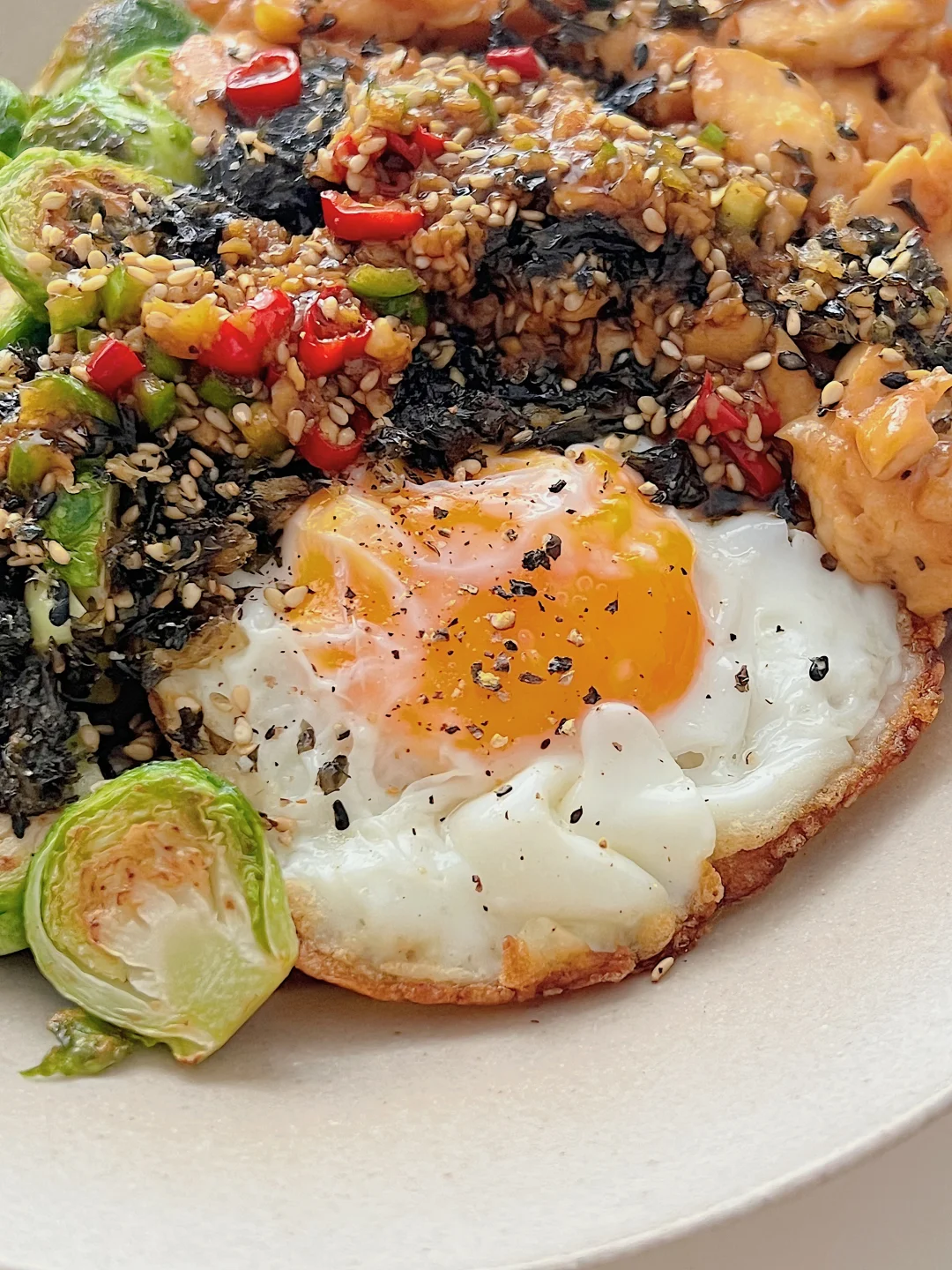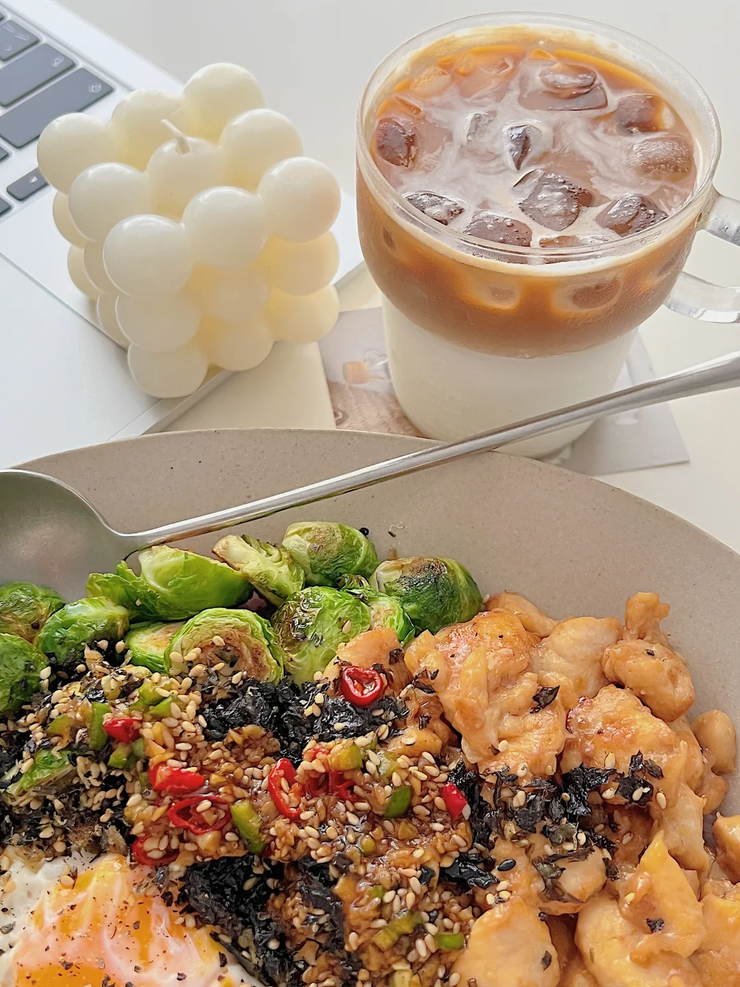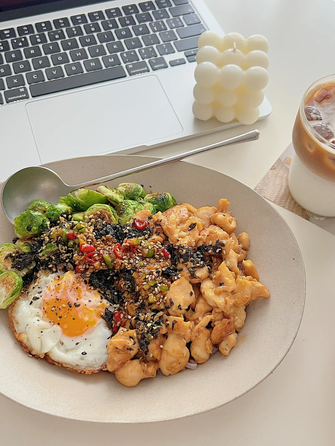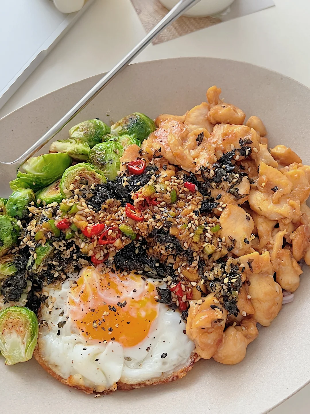 2️⃣平底锅三件套:先煎溏心蛋→再炒孢子甘蓝→最后煎鸡里脊