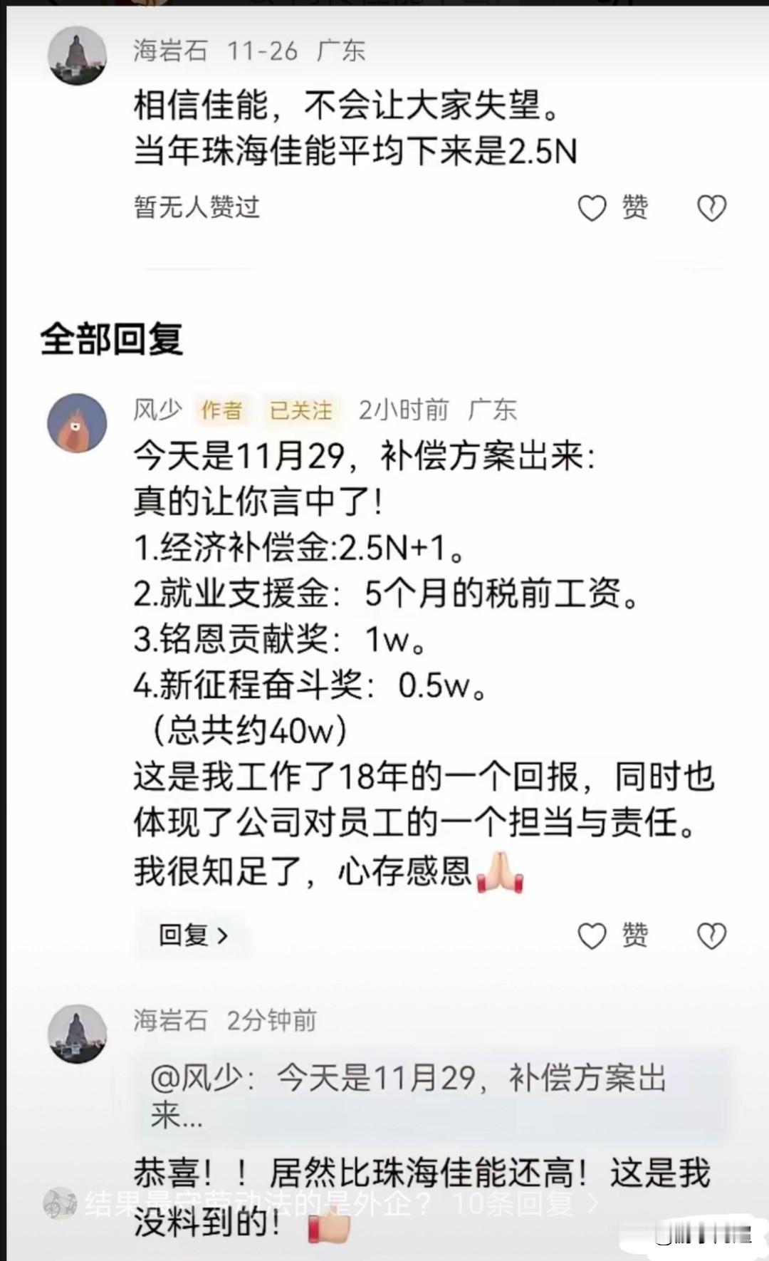 中山佳能停产给予员工的补偿方案已出炉,着实令人感动。 佳能(中山)在11月21日宣布停止营业后,即刻放假并与员工协商解除劳动合同的赔偿方案。 下面先来了解一位在中山佳能干了18年,获得40万补偿金的方案。 经济补偿金:2.5n+1 就业支援金:5个月的税前工资 铭恩贡献奖:1万 新征程奋斗奖:5000 这一方案已经刷新了两年前珠海佳能停产时给予员工2.5n的补偿方案。 中山佳能虽已关停,但最后留给员工的将是那句广为人知的广告语——感动常在佳能。