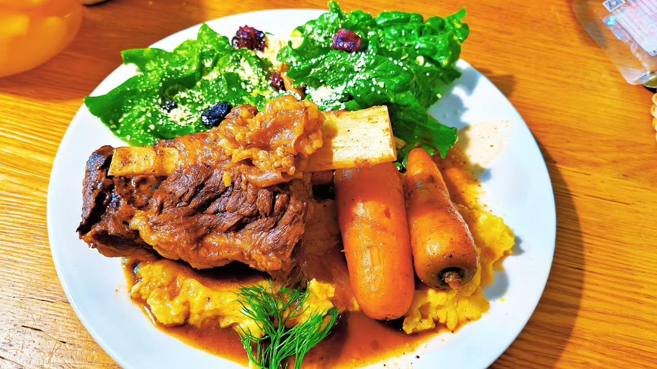 这道菜也太诱人了吧!软烂入味的牛肋排裹着浓郁酱汁,啃起来肯定超满足。旁边的胡萝卜炖得软乎乎,底下的土豆泥吸满了肉汁,还有清新的沙拉解腻。光看着就觉得味蕾在跳舞,要是能趁热来上一口,那幸福感绝了,感觉一整天的疲惫都能被这顿美味治愈!