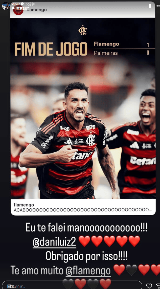 比赛结束后,出自弗拉门戈青训的维尼修斯迅速发布社媒祝贺母队,并圈出了打进制胜球的达尼洛,用表达自己的心情。
