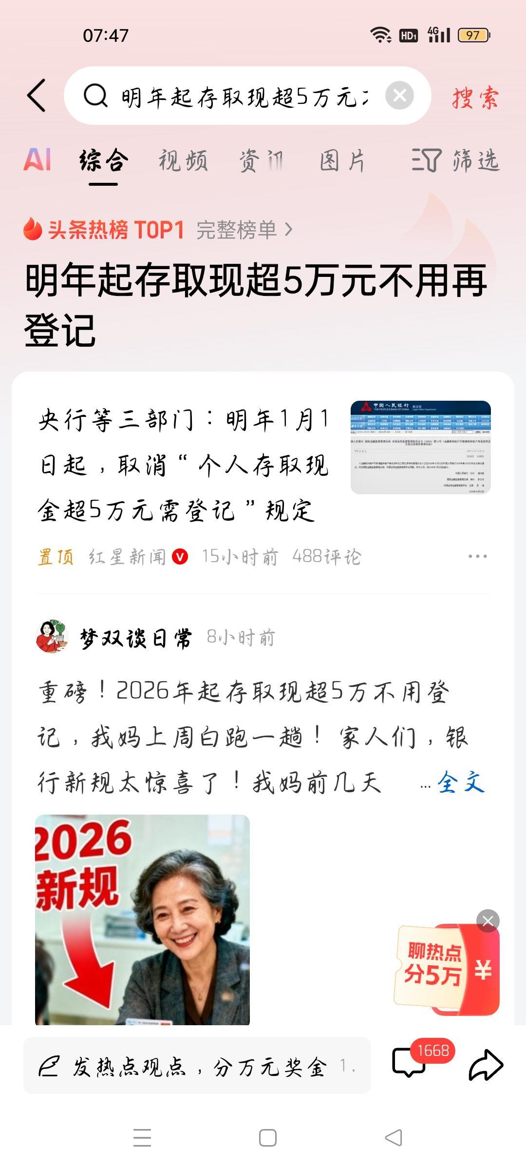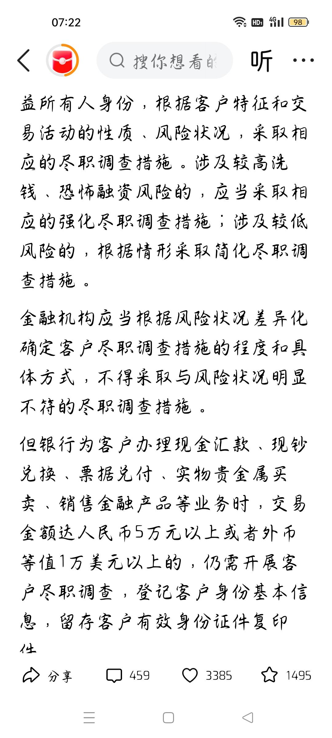 明年起存取现金超5万元不用再登记,我想说 据红星新闻报道,央行等三部门:明年1月1日起,取消“个人存取现金超5万元需登记"的规定,我想说,取消这一规定,更接地气,更人性化,根据法律规定,公民的财产受保护,隐私受保护,不过银行更要火眼识晴,有人说,我想取多少就取多少,你的理解有错,规定在办理现金汇款、贵金属买卖等业务,超过5万元以上,或者外汇超过1万美元时仍需展开客户尽职调查。个人认为,这是为客户、为银行负责。所以各位条友看了这个标题认为没有任何限制,还是有的,银行也要保障自己的权益。各位条友觉得呢?