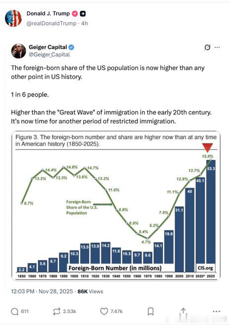 【黄金时代】川普转发,美国人口中出生人口的外国人口的比例已经接近16%, 是时候限制移民了。美国和欧洲当代史川普主义研究热点现场海外新鲜事